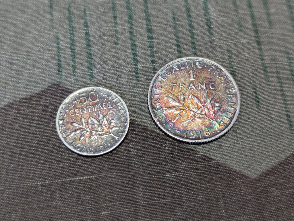 Lot of 2 French WWI coins. The 1 Franc coin is dated 1918 and the 50 centimes coin is dated 1917. In circulated condition. I am unsure of the metal content. I didn't think they are silver, but most sources and other online sellers say they are.