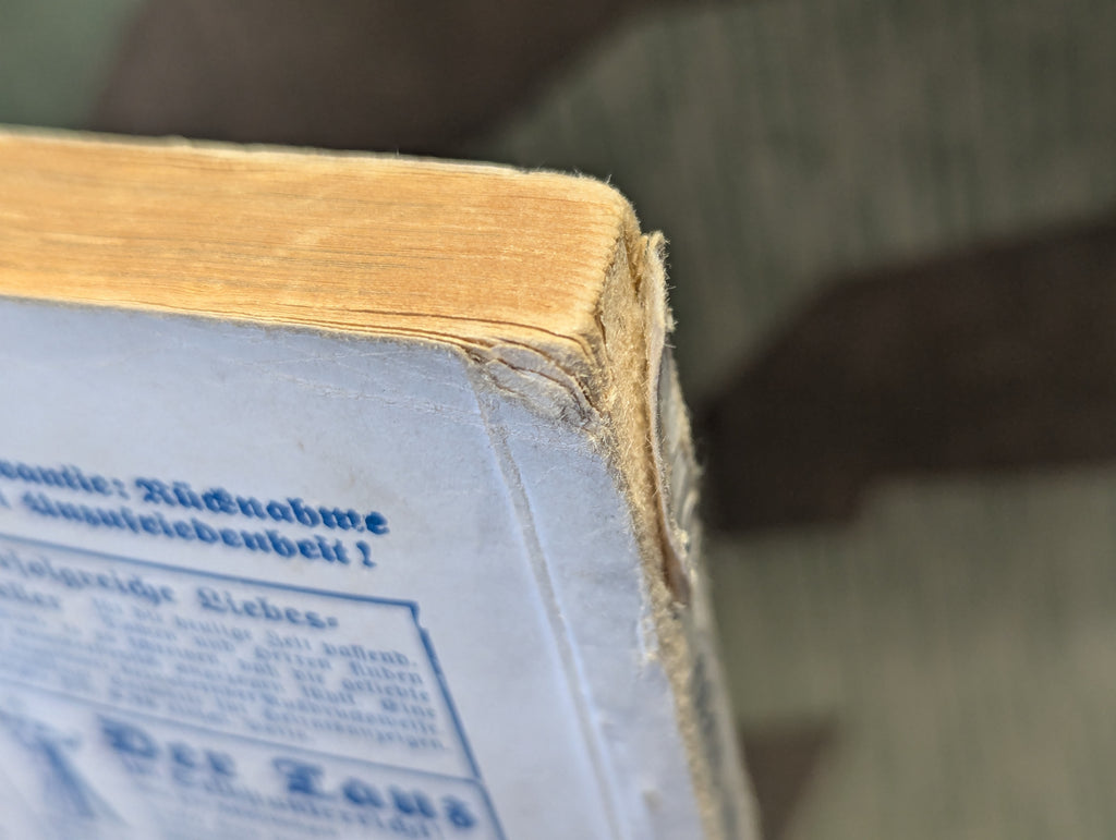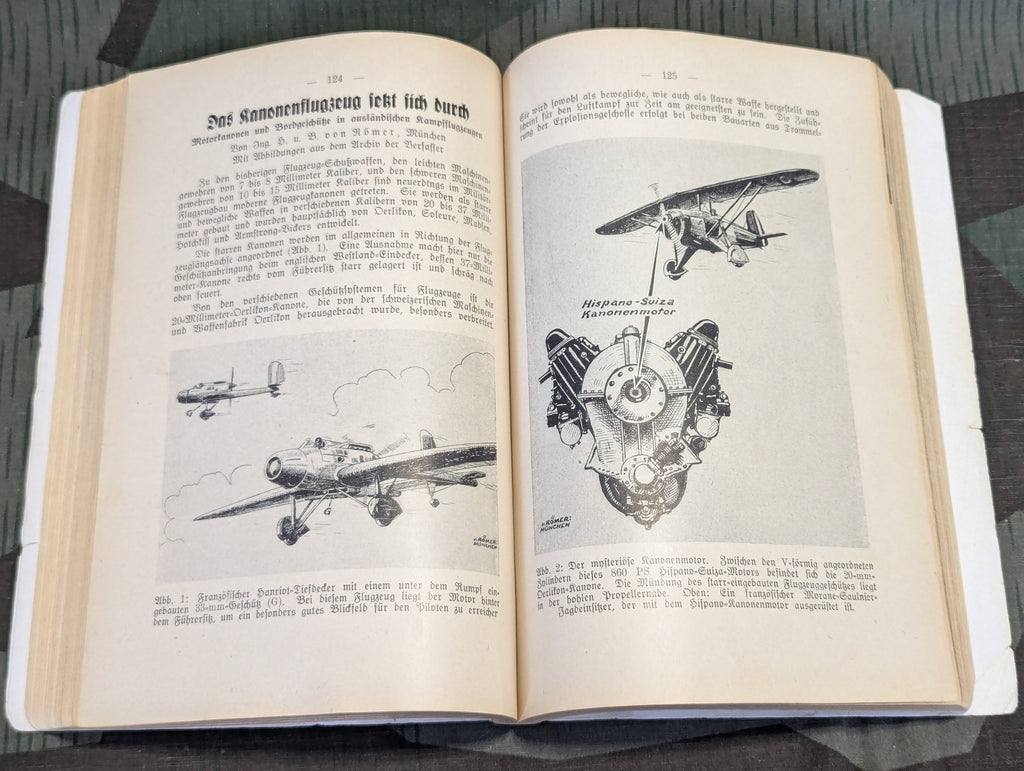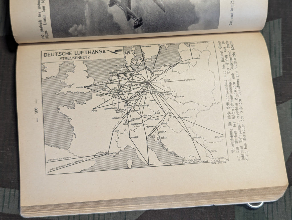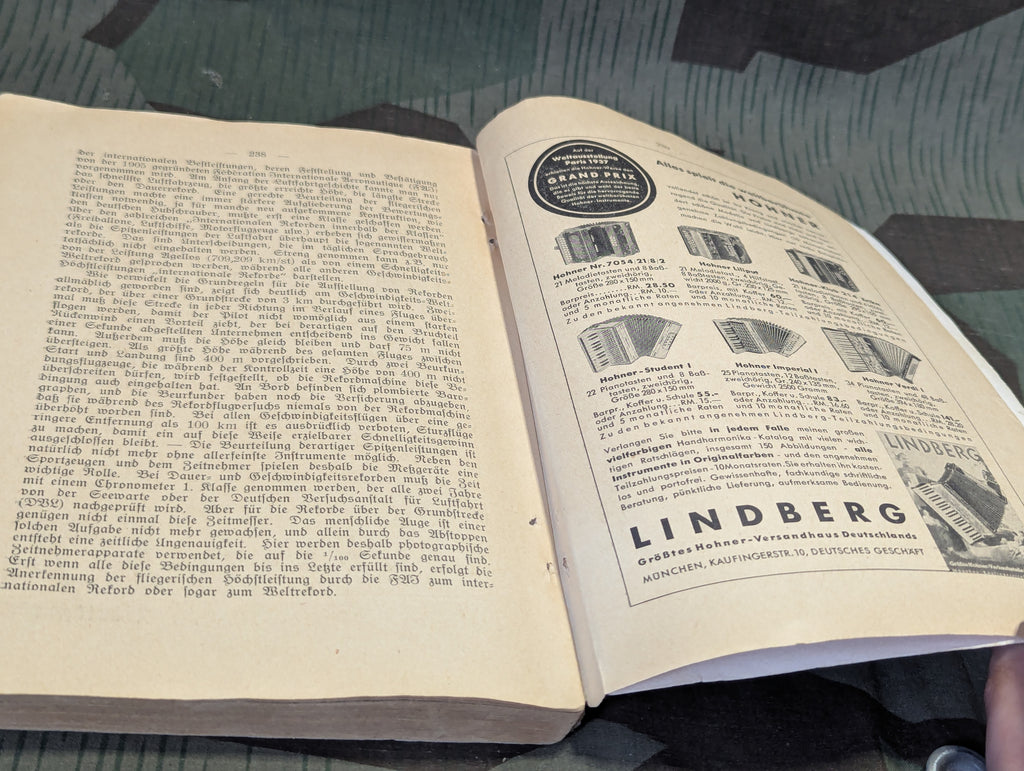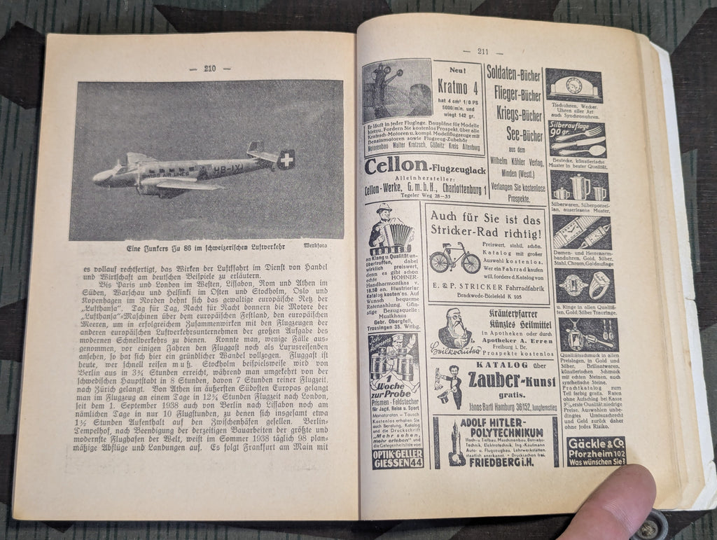 Interesting original 1939 Flieger-Kalender. Sort of a flight themed almanac. A handful of pages are been partly or fully cut out. I believe I saw at least 3 such pages when flipping through it. It has a whole lot of ads in it and many are interesting. There are also loads of articles about flight past present and future, including plans for an underground airfield. The back page or two in the back of the book have pulled away a bit from the back side of the spine, they are not detached completely or anything just pulled up from the staple binding.