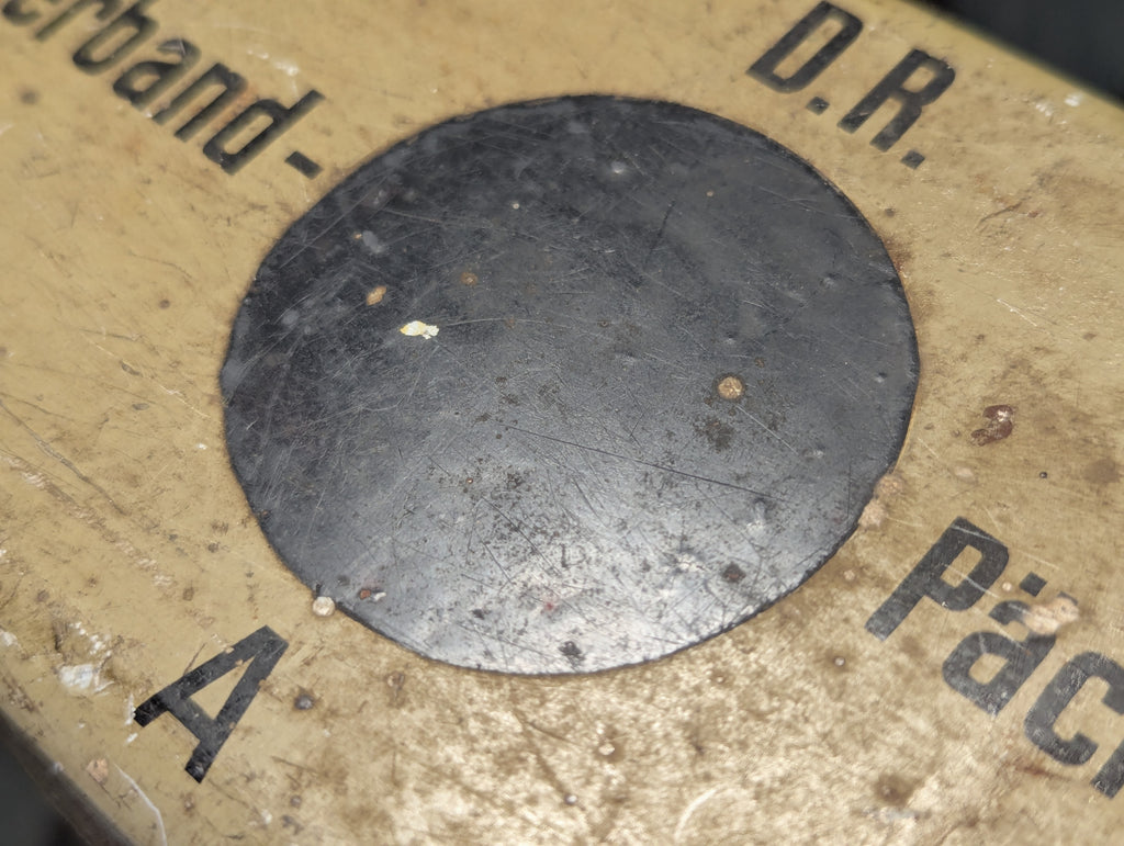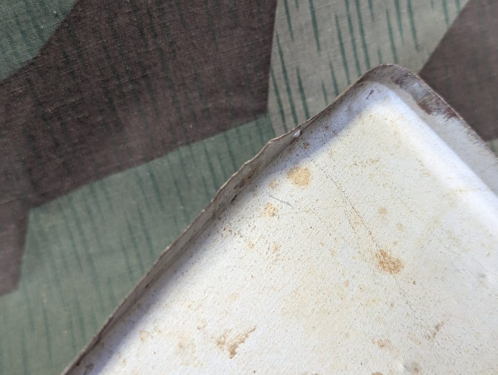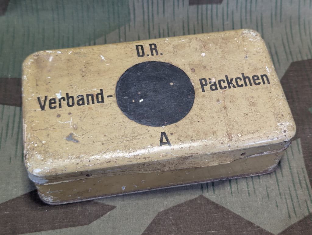 Original Deutsche Reichsbahn Verband Päckchen empty first aid tin. Its a bit dirty and there are some pry marks on the edge of the lid. The red cross at the center has been painted over in black.