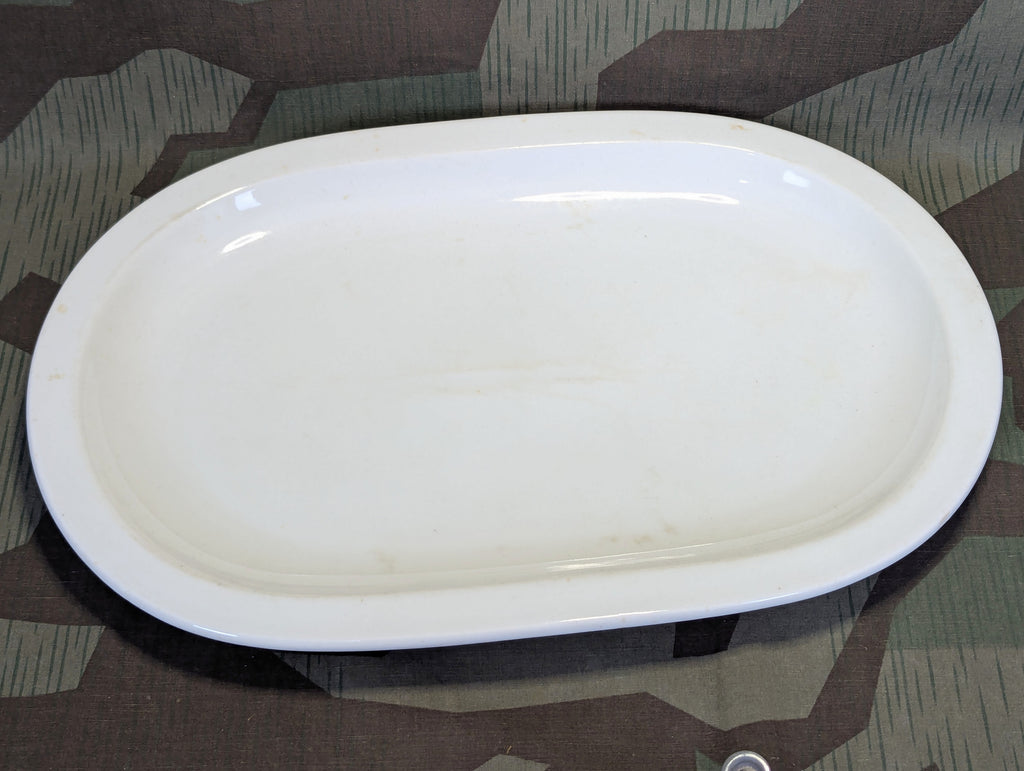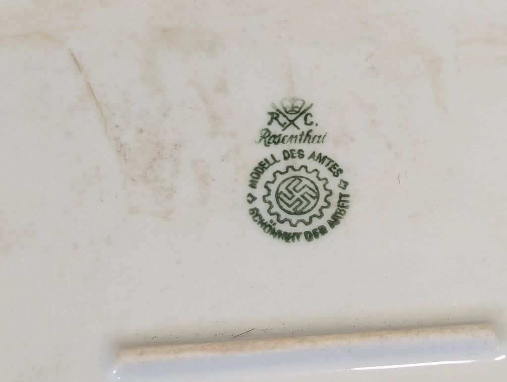 Schönheit der Arbeit porcelain platter. This would have been found in a factory lunch room or similar setting. The DAF is the largest workers union in history which was a very different and political approach which basically sought to get the most of of workers while trying to improve their working conditions, vacation time etc... Basically acting almost like an arbitrator while also trying to ensure the best result was ultimately in favor of the state. A very interesting thing to read up on if you're not familiar. Anyway, one of the things they did is ensure employees had access to clean quality dining facilities. This is in good condition, but a bit dirty. I tried cleaning a bit, but its going to need more soaking and scrubbing. Personally I find nearly all of the porcelain produced for the DAF as well as the Wehrmacht to be very aesthetically pleasing and practical. I pretty much only use these at home. There is a quality about them that I can spot a mile away.