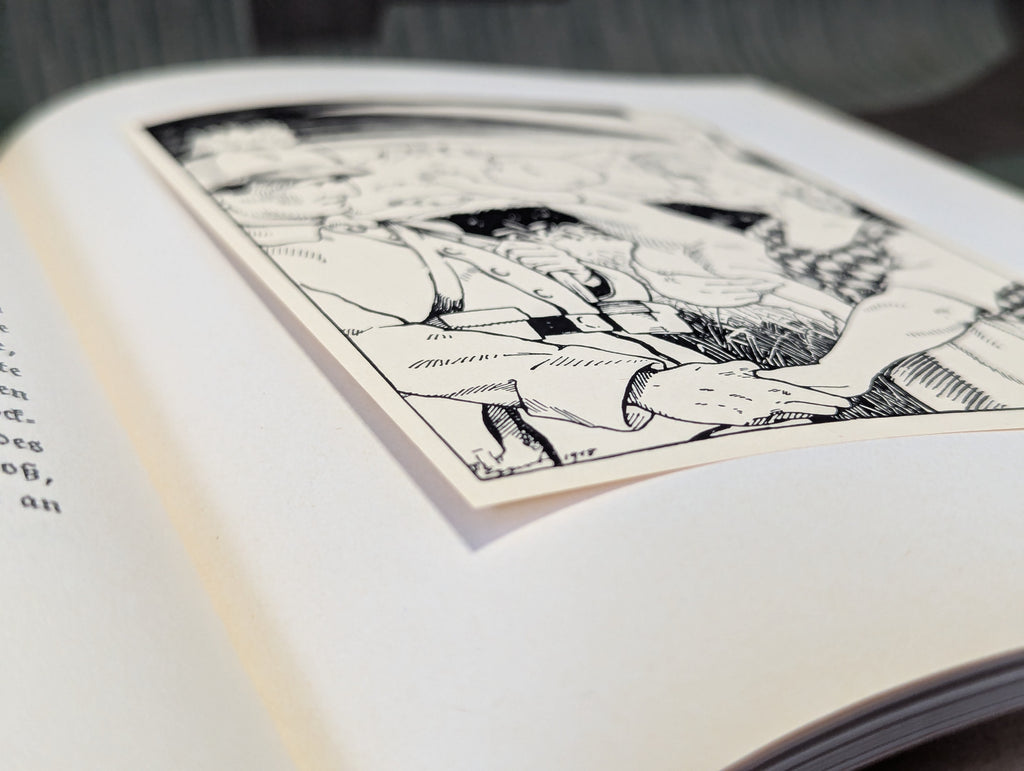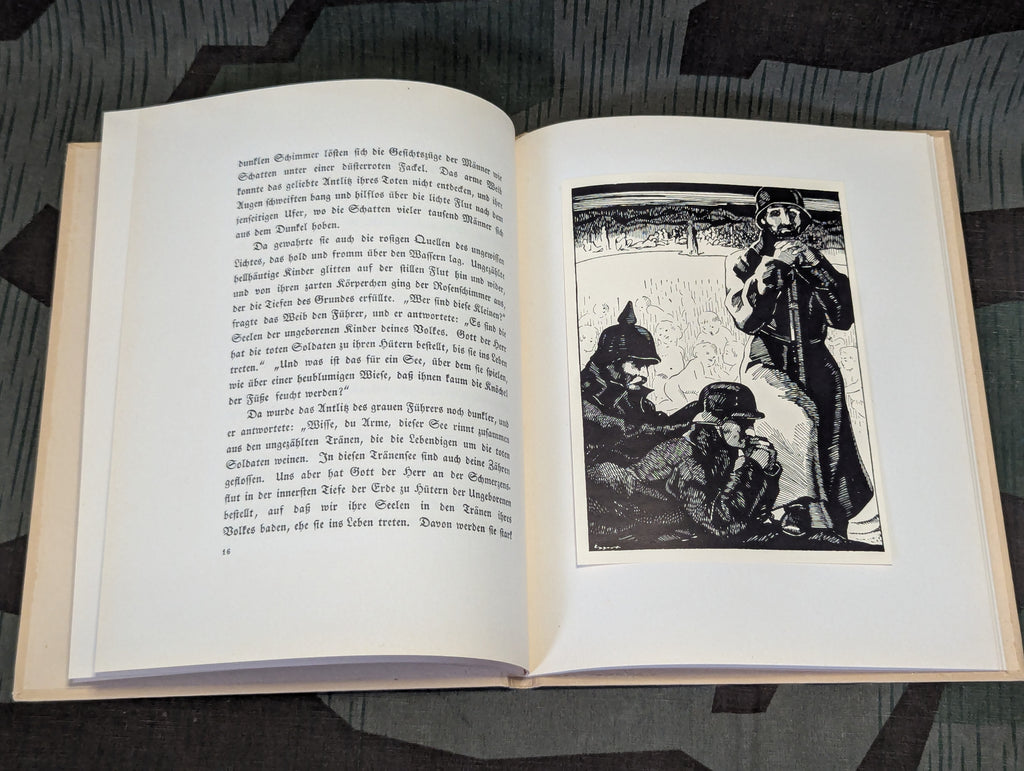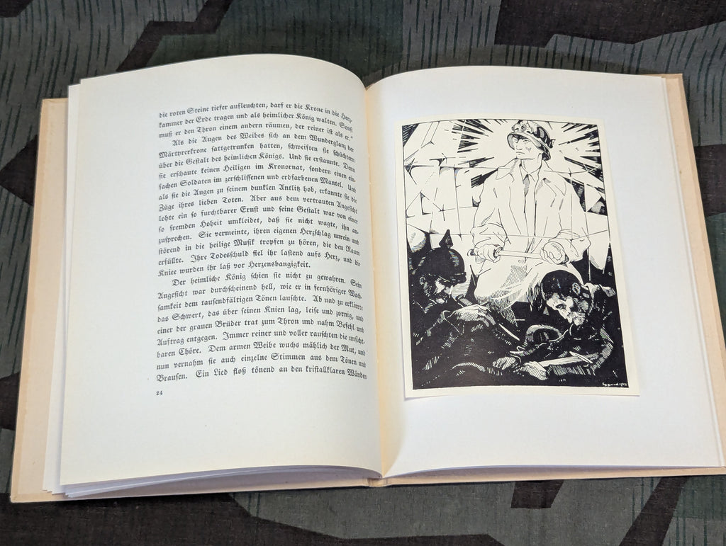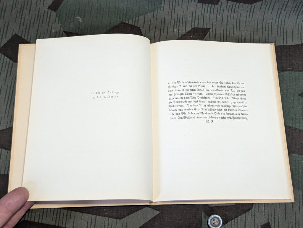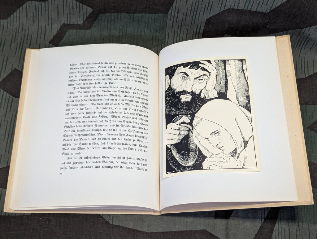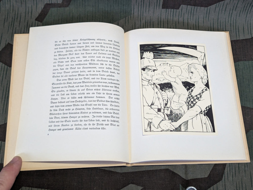 Original "Das Weihnachtsmärchen des Fünfzigsten Regiments" pre war copy of the Christmas fairy tale of the 50th Regiment with prints by Benno Eggert. The illustrations are done very well, they are actually separately printed attached to the page. It is in fairly good condition with some discoloration from age.