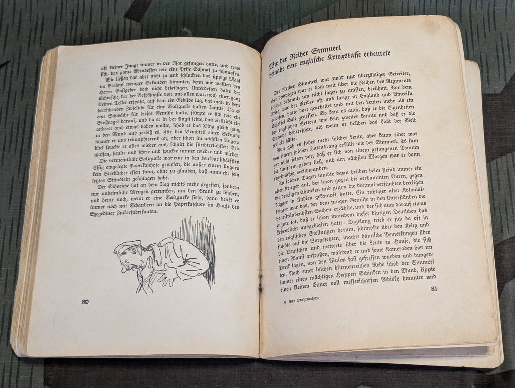 Original Der Drahtverhau (The Wire Entanglement) book of soldiers humor. It is mostly stories, but also has some illustrations, mostly from the Great War. I couldn't find a publication date. There is an acceptance stamp for a lazarette, but someone has scribbled in pen over it.