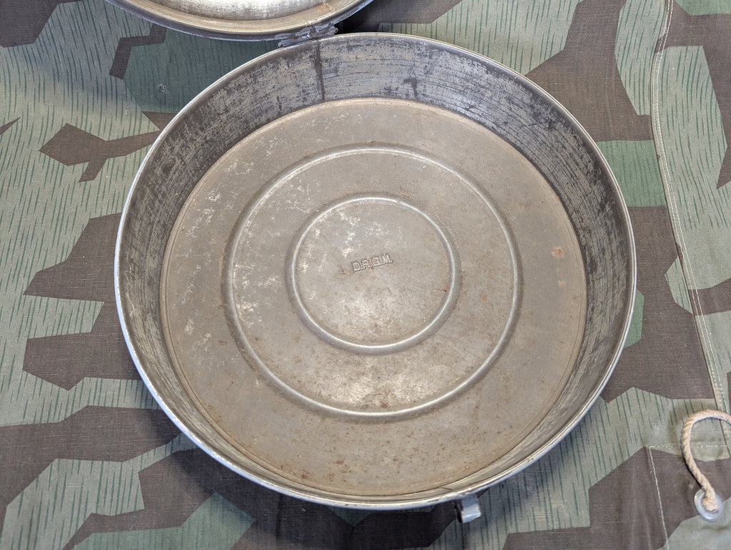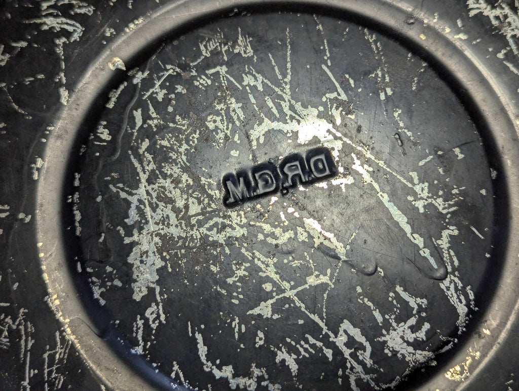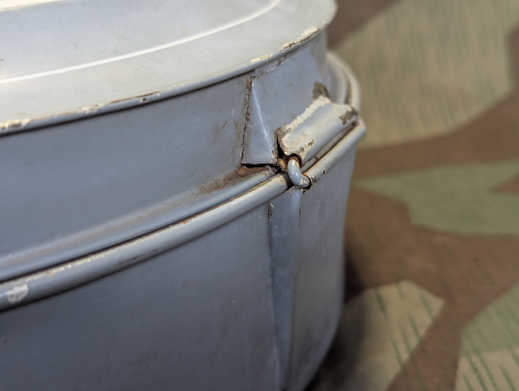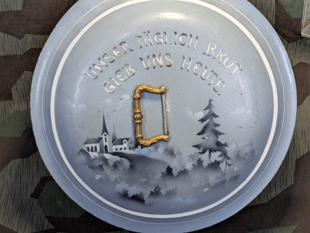 Very nice original bread box, roughly the size of a typical round loaf of German Bauernbrot. Hand painted on top with a village with some trees and bushes and the traditional "Unser täglich brot gieb uns heute" phrase across the top. The tin is embossed DRGM on the bottom. It has some minor wear, but in overall very nice condition. The lid is a little difficult to line up with the latch when you close it. I have managed to close it several times, but it takes a little fenagling.