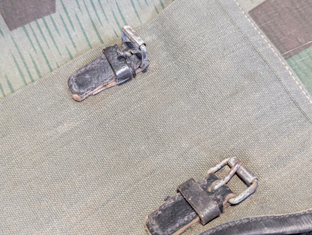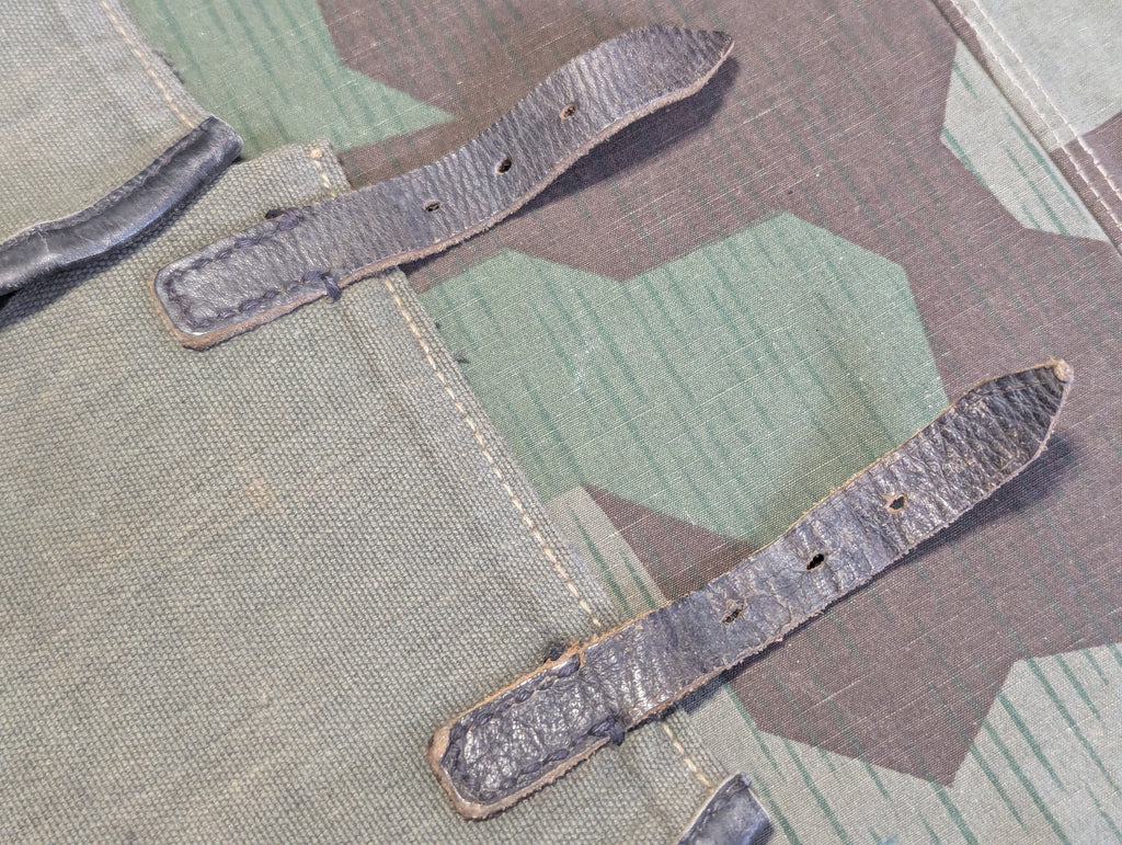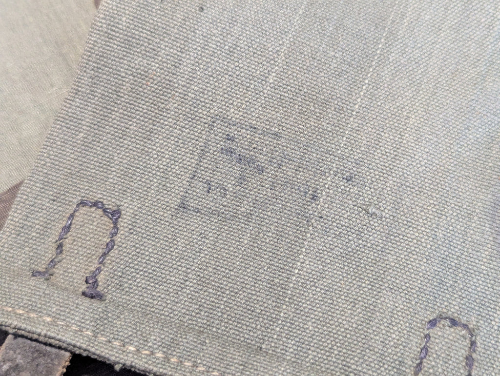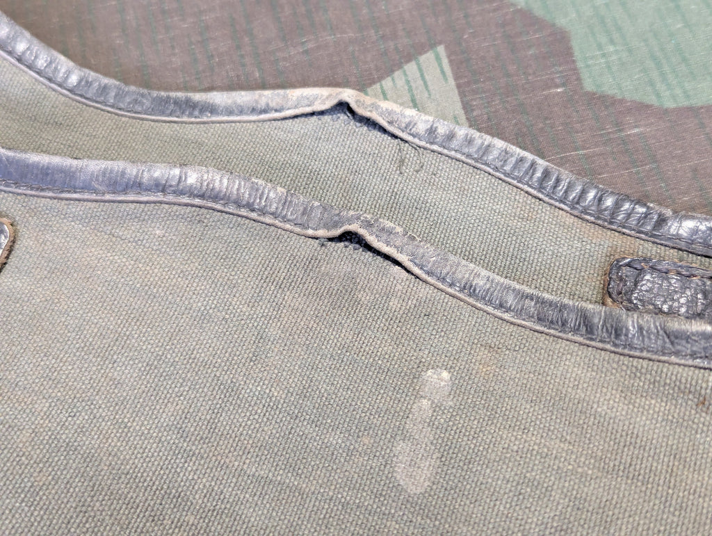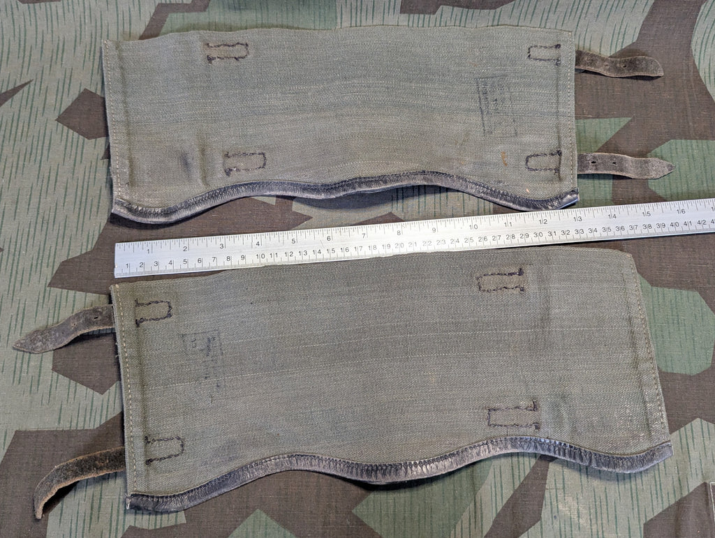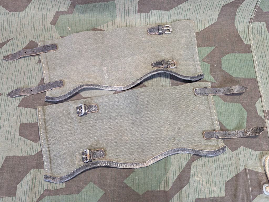 Nice lightly worn original M31 Gamaschen. This is the style you see pre war with the leather trim and the pre war color canvas. This is a matching set. Both are marked, but I can not make out the markings. Some of the stitching on the leather trim is popped, right around where the ankle would have worn against it. This would be a good pair for an early war mannequin build.