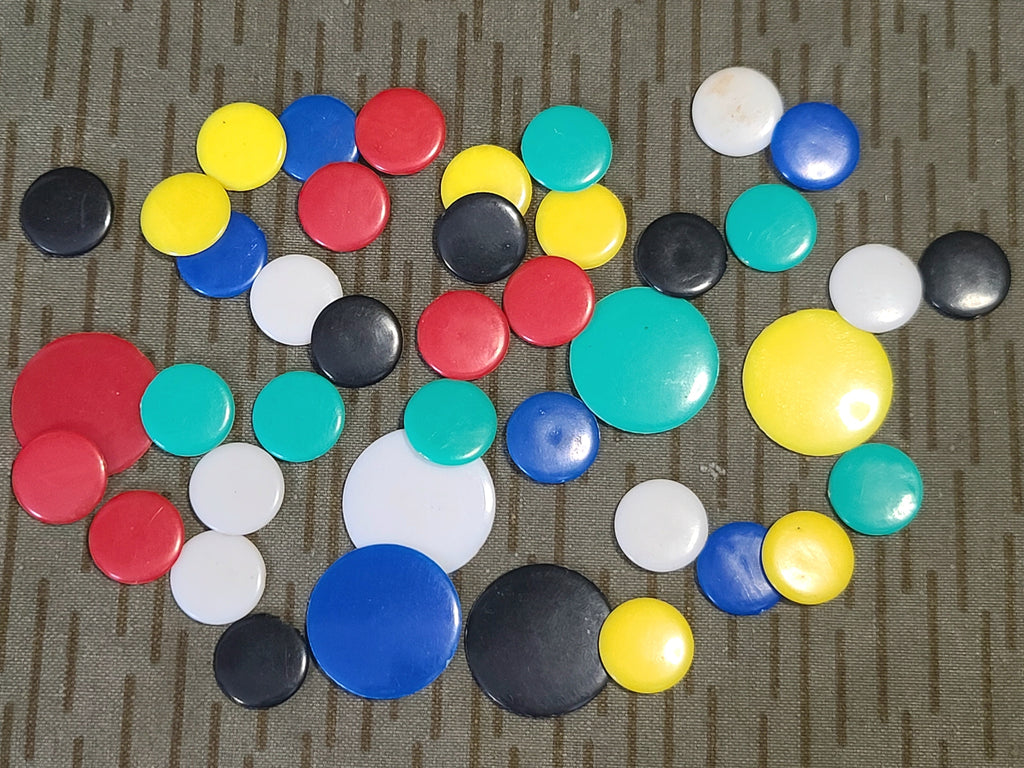 East German Knips-Spiel game. Probably 1950s. Bakelite container marked WARI. Inside are small colorful plastic discs and game instructions. One small blue disc looks to be missing and some discs are a little dirty. The label on the top is ripped.