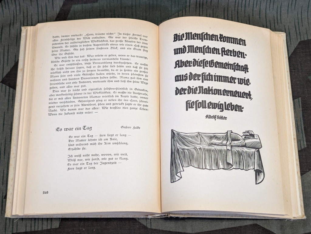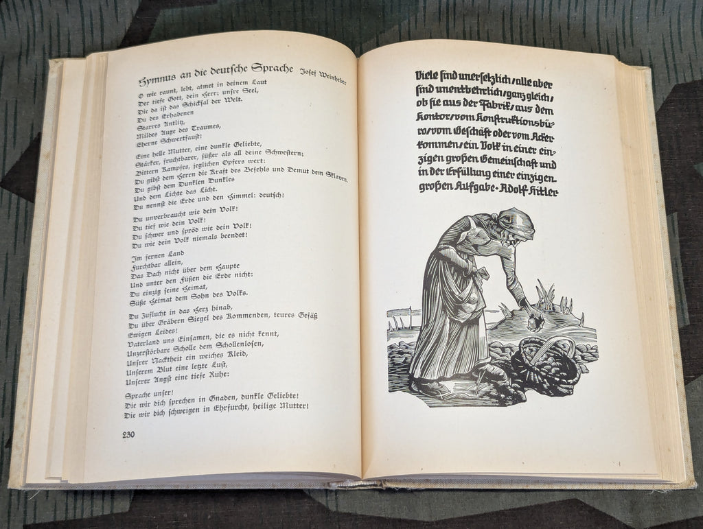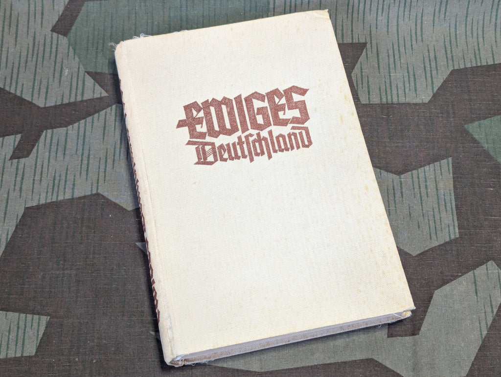 Ewiges Deutschland 1939 (Eternal Germany), this is a book that was distributed by the Winterhilfswerke. There is a dedication with a signature from the kreisamtsleiter or district leader, indicating this was a gift to a work colleague. It is in good condition.