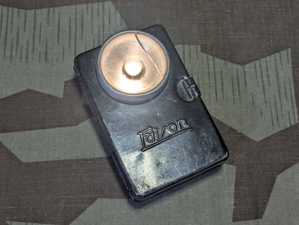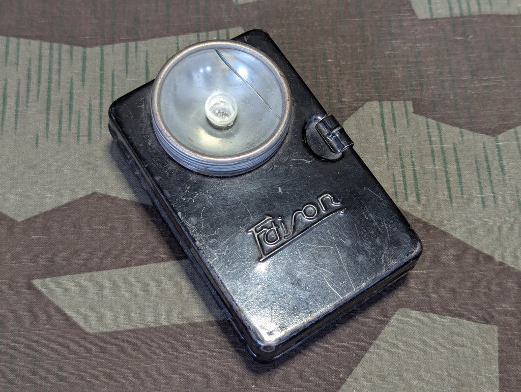 Period Fasion brand flashlight. It is in working condition. The lens is cracked, but it could easily be replaced with how this flashlight is made. It has a wire type button loop on the back. Has some corrosion inside. Battery not included.