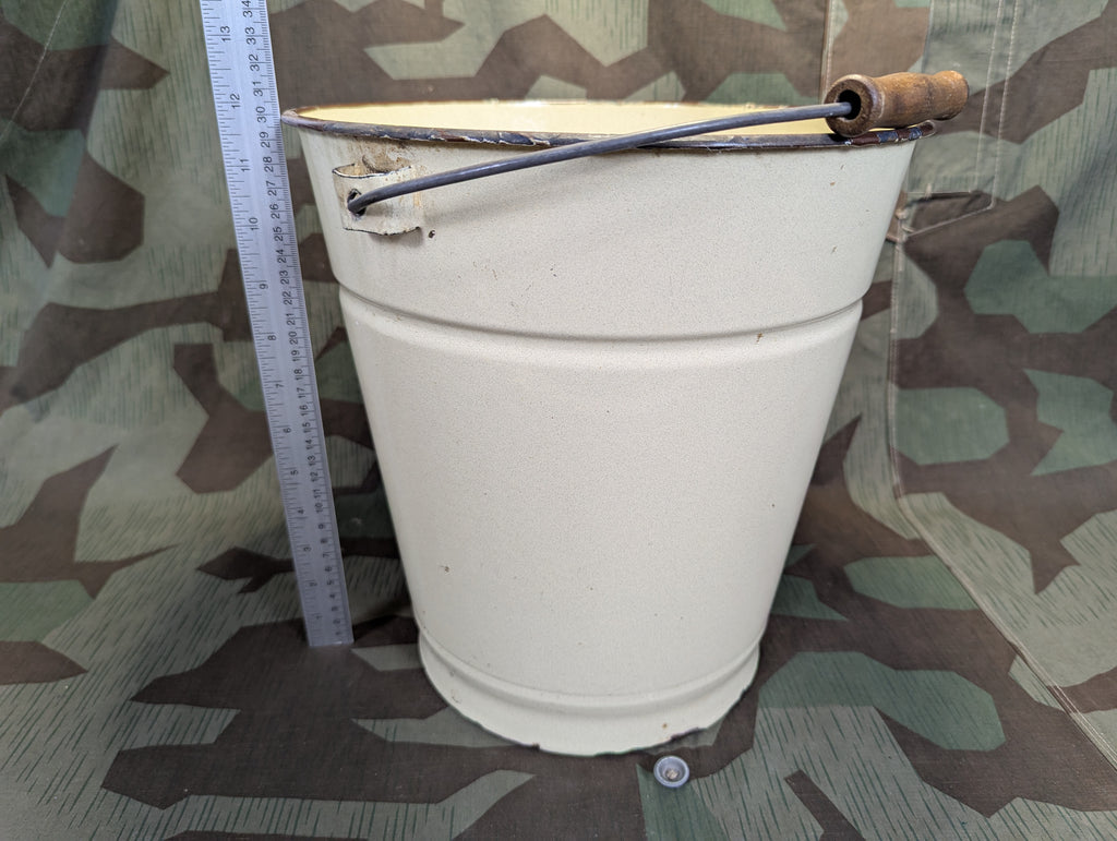 A typical European bucket made from enameled steel. It has some chips in the enamel around the top and bottom edge, but the bulk of it is in good condition. A great item to have around camp as these were ubiquitous across Europe. This style has been around a long time and has been made basically unchanged since the early 1900's. This is an older one, hard to date precisely but fits the 1930's and beyond. Newer ones are usually a little lighter duty and have become much more decorative or "primitive" in appearance as that is a look these days. The price is what it is because of the cost of shipping this back from Germany.
