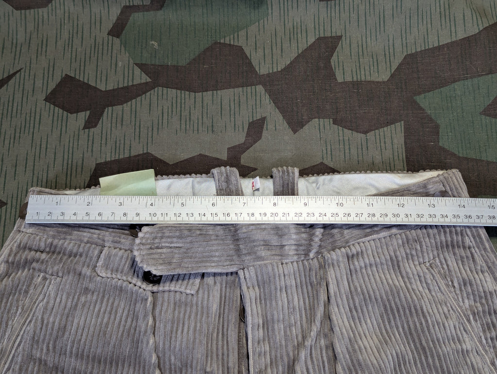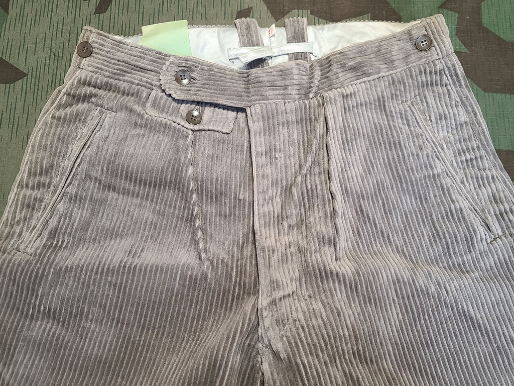 Vintage 1930s / 1940s German gray corduroy plus fours. New old stock with original tags. The size is marked 42 and the waist measures about 28" (it can be cinched in even smaller). Inseam is about 26 1/2" and the length is about 39 1/2". Button front fly. Pockets including a small watch pocket and a back pocket. Buttons inside for suspenders. There is some storage wear and discoloration - mostly along fold lines. Some of the buckles have rust.