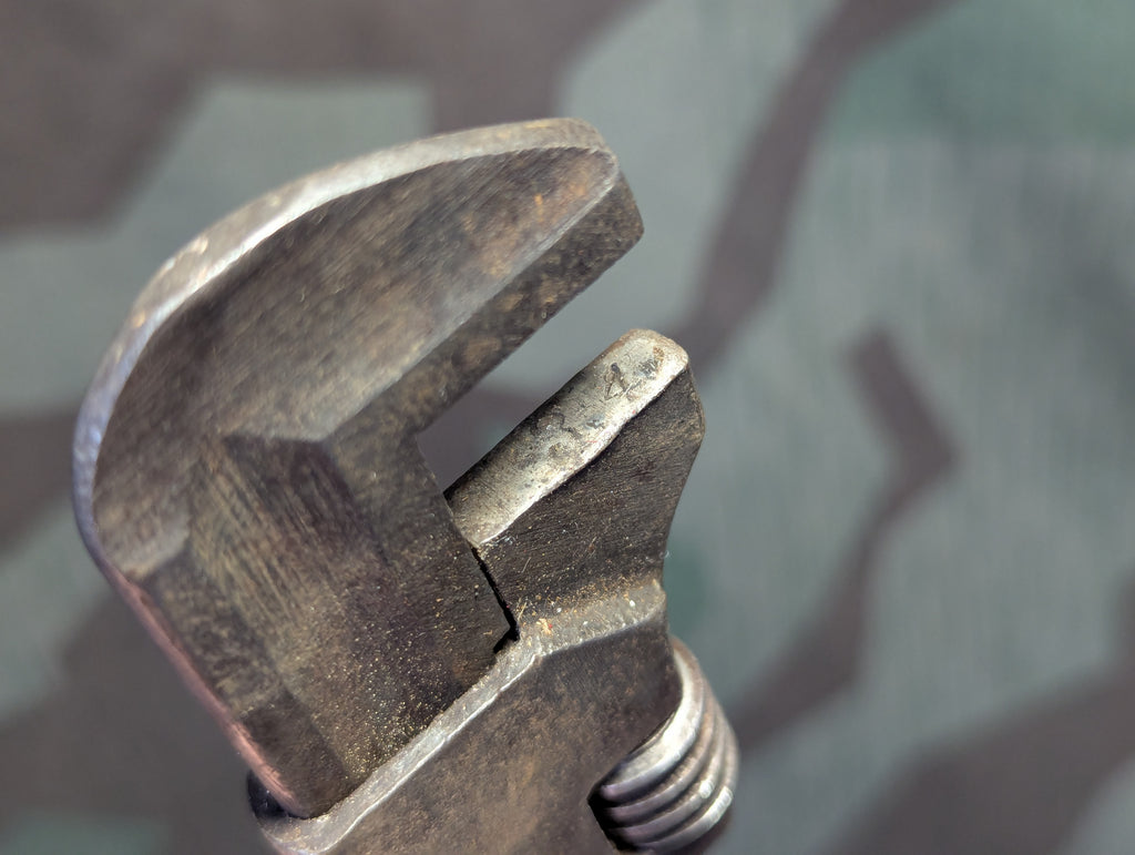 Nice small German steel adjustable wrench. It is in good working order with a little marring on the jaws from use. This would be a very nice size for a motorcycle tool kit. I found no markings.
