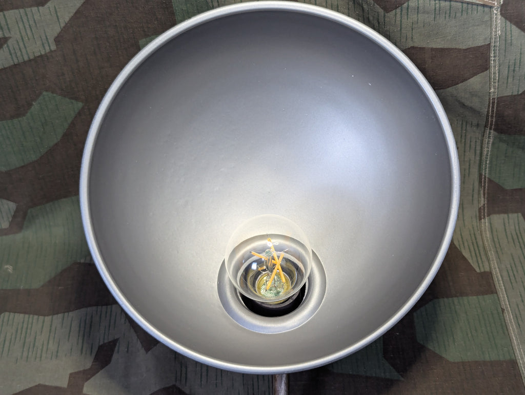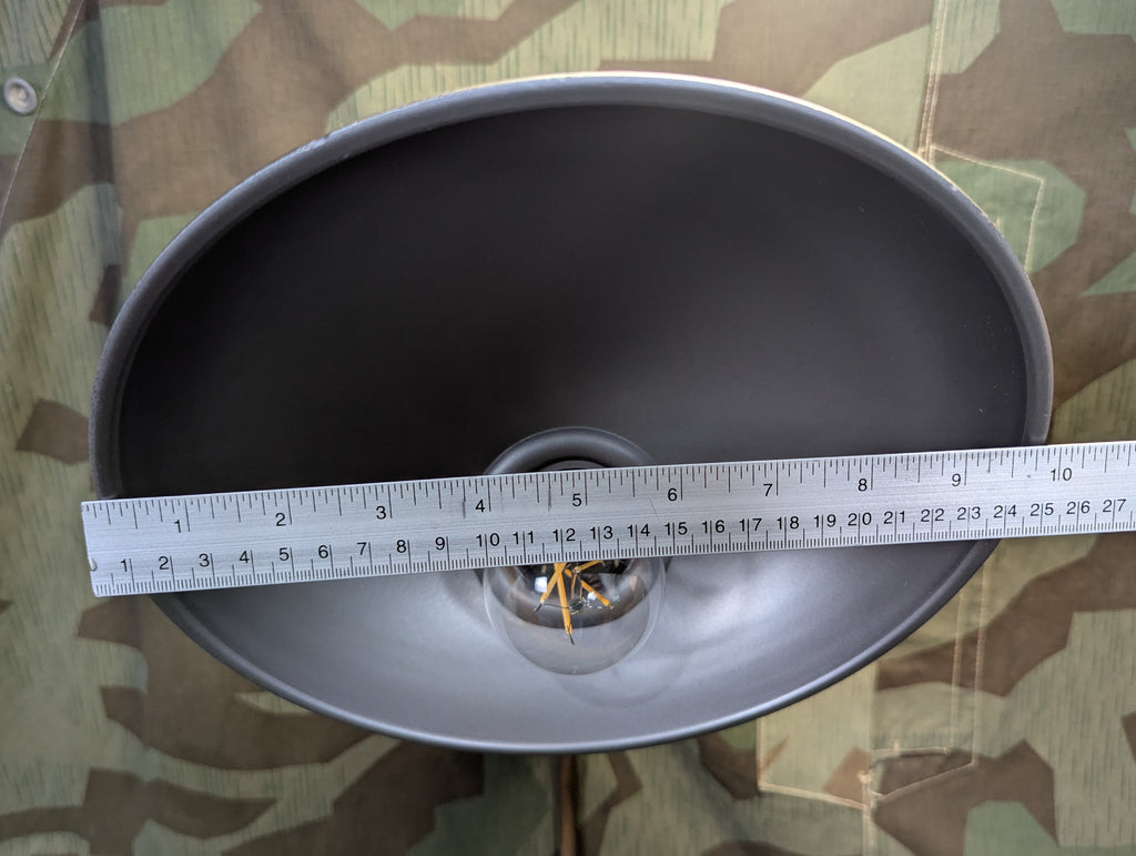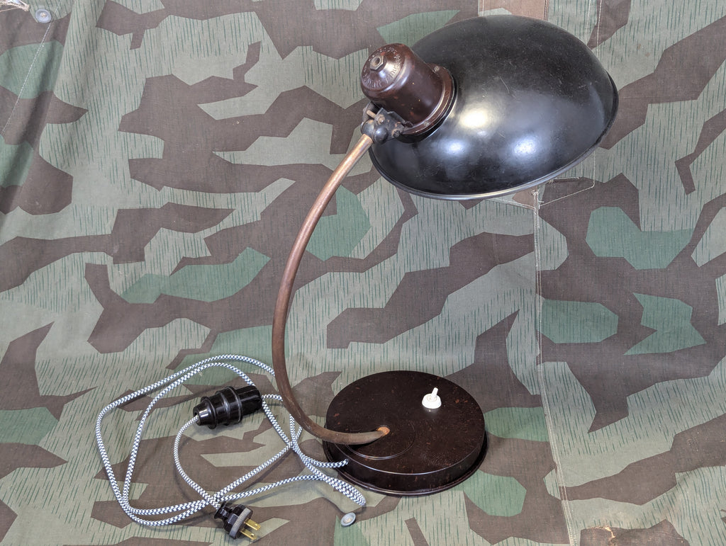 This lamp was produced from the 1930's into the post war era. Most parts on this one are made and marked like the older war time models, but the white switch is a post war replacement (although it is actually a common style switch on pre war lamps, this one is East German marked). I find the white plastic switches distracting, but they are absolutely correct and it does give this particular lamp a nice look. This is a very nice lamp with lots of adjustment. If you have need for a classy office set up, this is a stand out piece with a great look. It may ship disassembled slightly, There are 3 small screws that hold the shade on and it is far safer to ship with that removed.