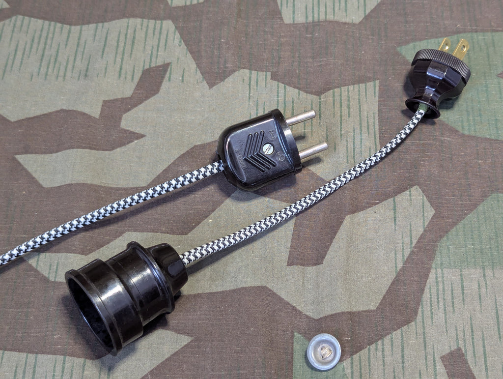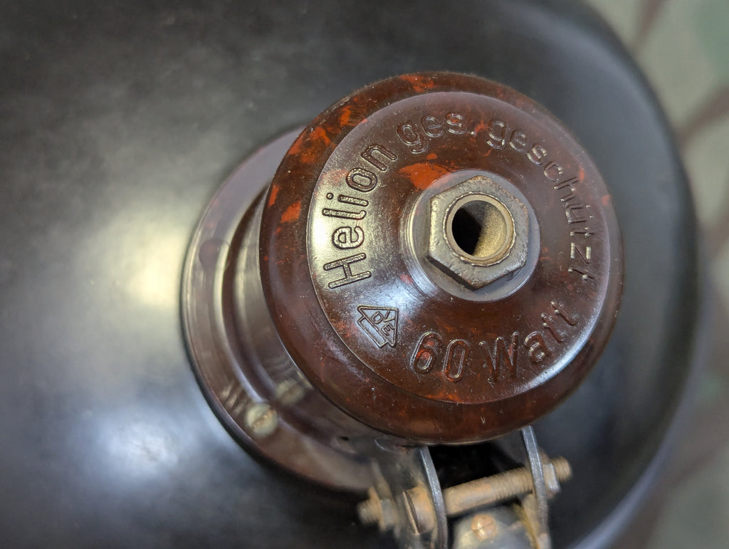 A very nice original Helion Bakelite desk lamp in good condition and newly rewired. We also include a vintage look Germany to USA plug adapter so the lamp can retain its German heritage and still plug into a normal American outlet.