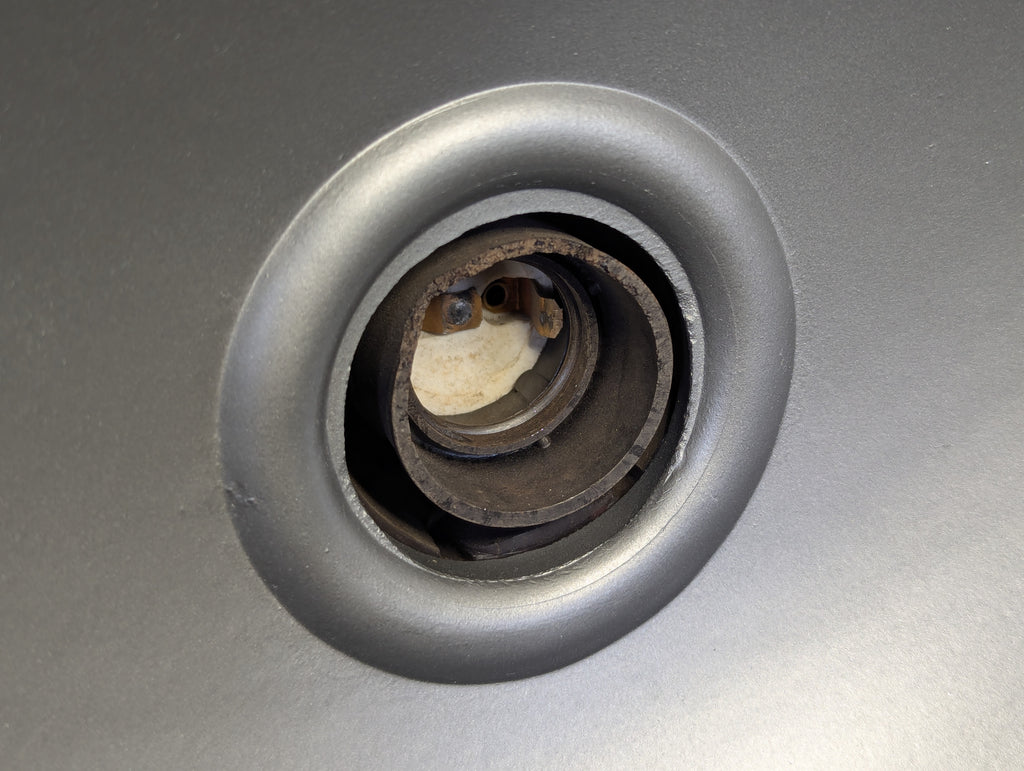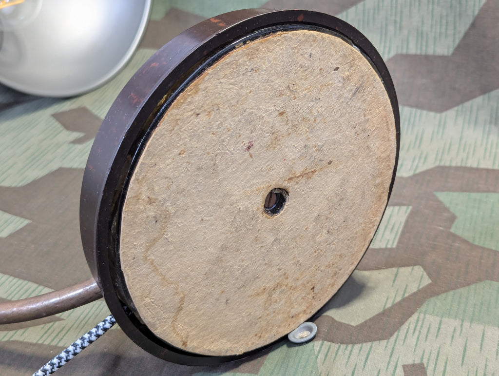 I cleaned this lamp up a bit and repainted the silver on the underside of the shade, as is was mostly worn off. The metal tube connecting the base and lamp has an even patina which I left alone as it gives the lamp character. The Bakelite base sits on a thick heavy chunk of glass which gives it weight. The glass was repaired at some point, as there is a glued crack down the center of it, which is only visible when you have the lamp taken apart.