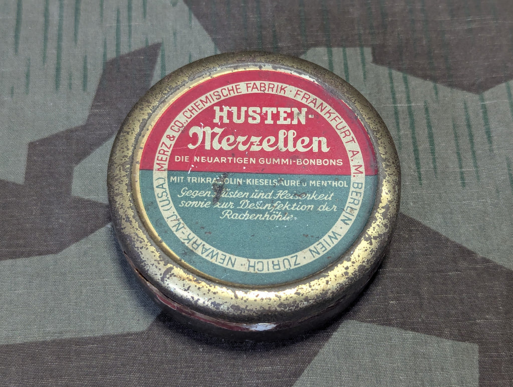 Period Husten-Merzellen tin for gummy cough drops. For cough, hoarseness and disinfecting the throat. They had locations in Frankfurt, Berlin, Vienna, Zurich and Newark, NJ. It is a little worn with some rust inside.