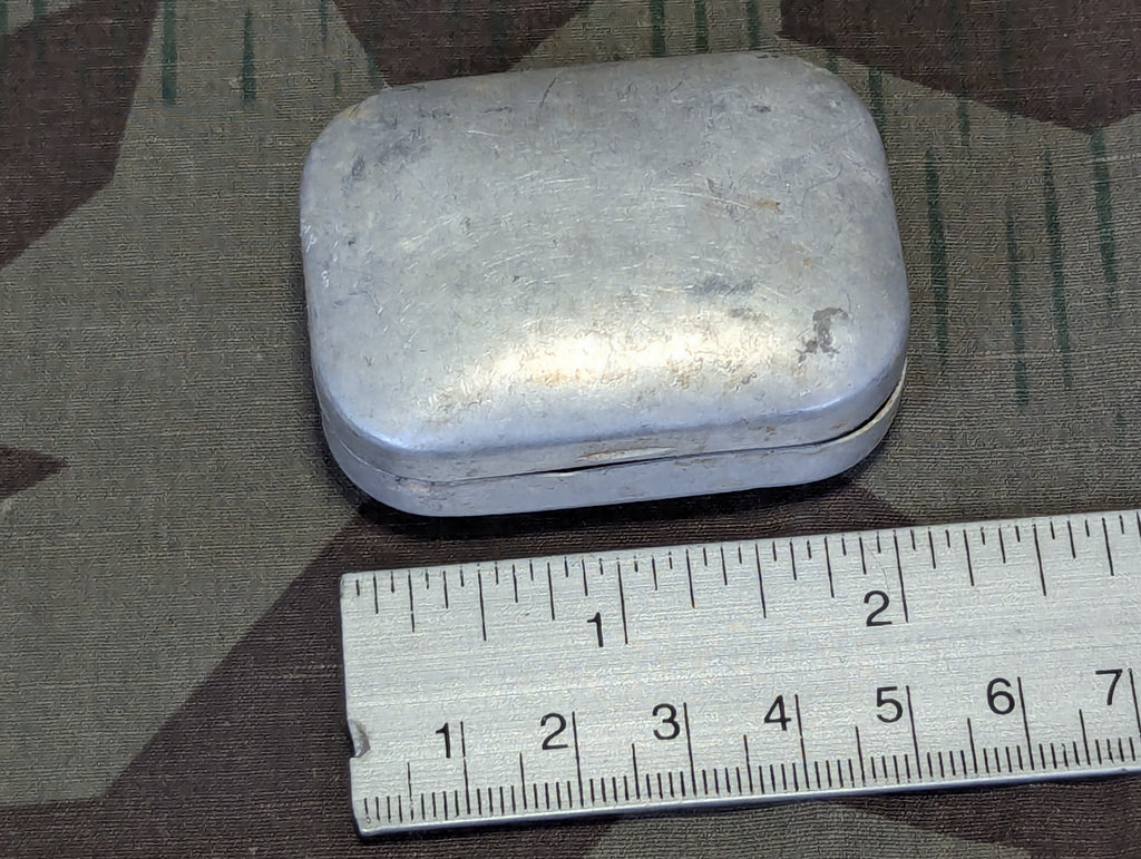 Original tiny aluminum Kaloderma travel soap container. It is in OK condition with some denting and some soap residue inside. Still usable, just needs a cleaning.