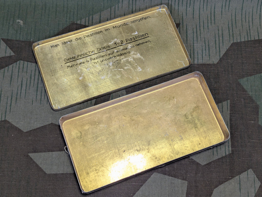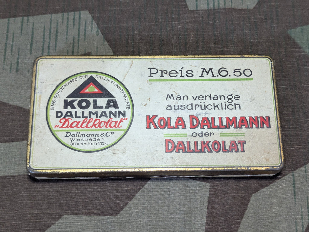 Pre-war Kola Dallmann - Dallkolat empty energy supplement tin. This was a popular "wachhaltsmittel" in Germany from the 1920's well through the war. The inside states to eat it like chocolate and that a comfortable dose is 1 or 2. The company changed their logo a few times making it easier to date this tin as pre-war. It is in good condition with light wear and the graphics are still quite nice.