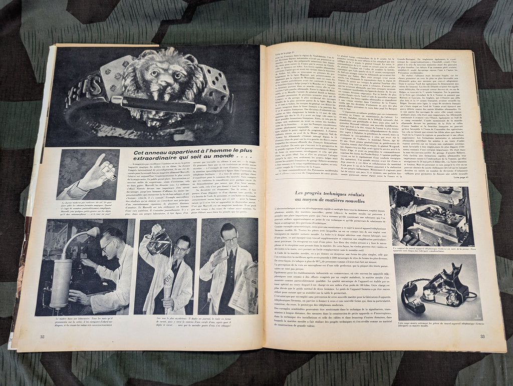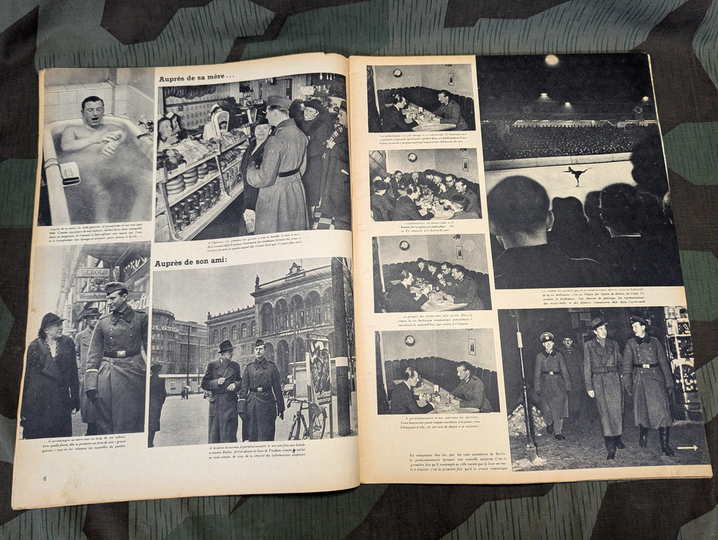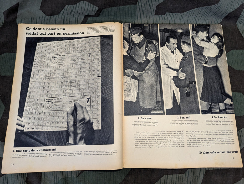 Original March of 1941 Signal magazine in French. Another nice issue of Signal with a number of good color pictures and a lot of very good ads. I found flipping through this one to be a bit more interesting than most. Lots of nice photos of soldiers and equipment including a gravity knife and some other pilots pocket contents. In fairly good condition overall. The center page is loose. May ship slightly rolled.