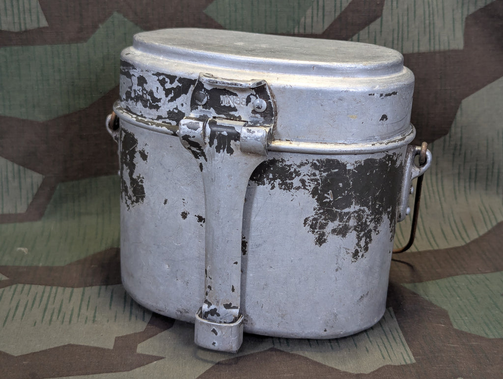 Nice, well used but well cared for German M35 mess kit. The lid is marked MN38 and the bottom is marked DMN 38. I believe these are the same maker. What paint is left does appear to match. It is quite clean inside. It has minor dents and wear and maybe just a little paint remaining.