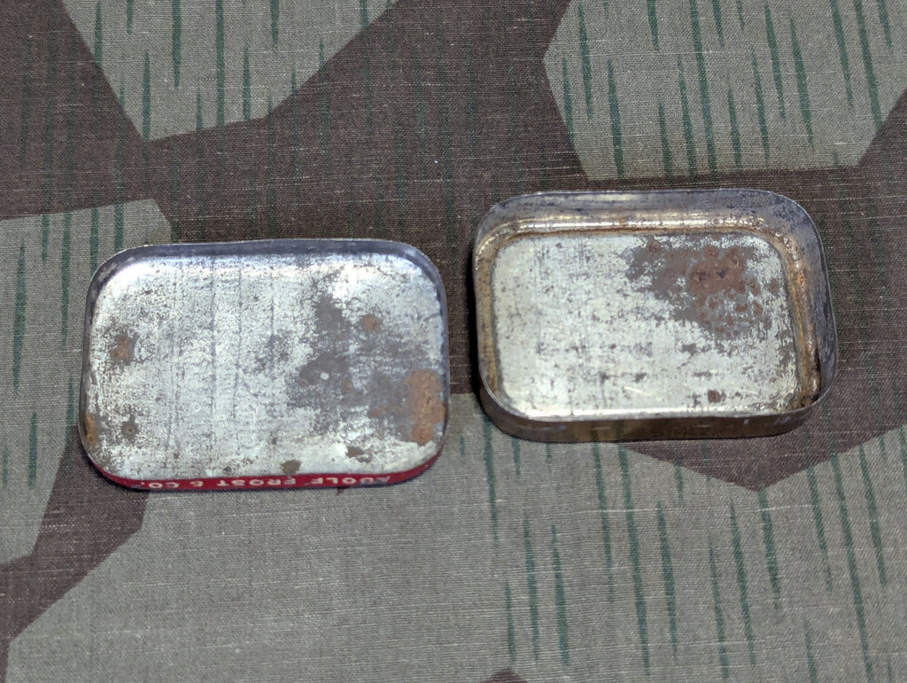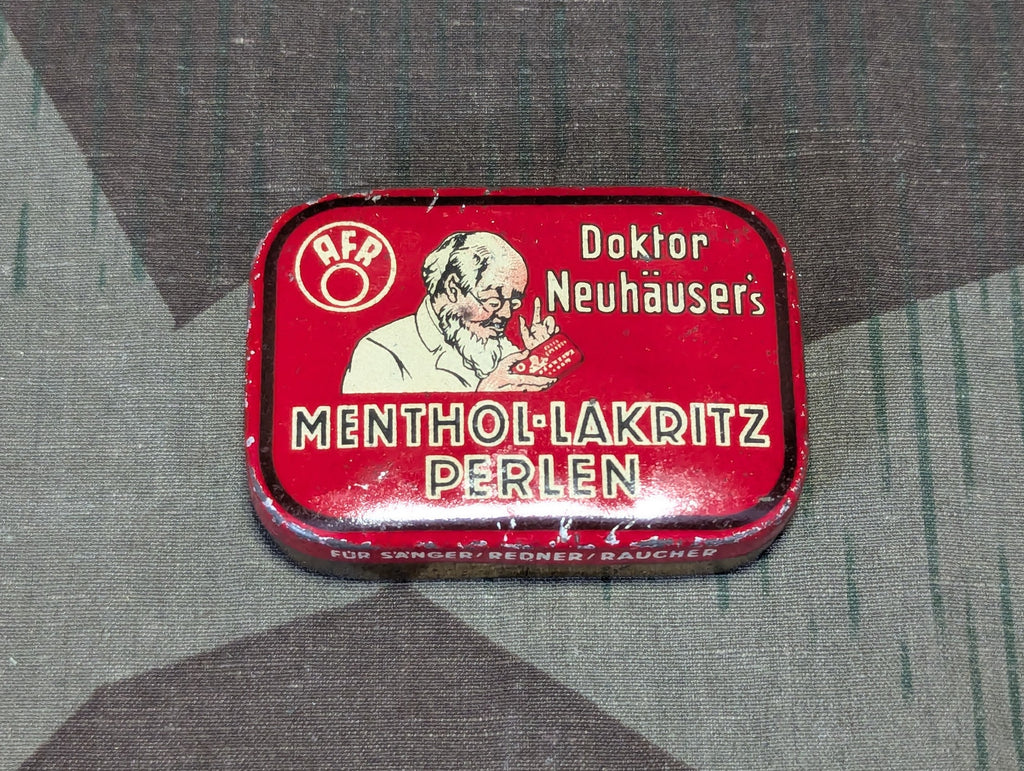 Nice original Menthol-Lakritz Perlen cough drop tin from a smaller manufacturer. made by Adolf Frost & Co AFRO-Werke. It is somewhat worn inside, but the graphics are still fairly nice, well interesting. The guy looks pretty goofy, not exactly someone I would take a recommendation from about much of anything and I would have many reservations if he was trying to feed me anything.