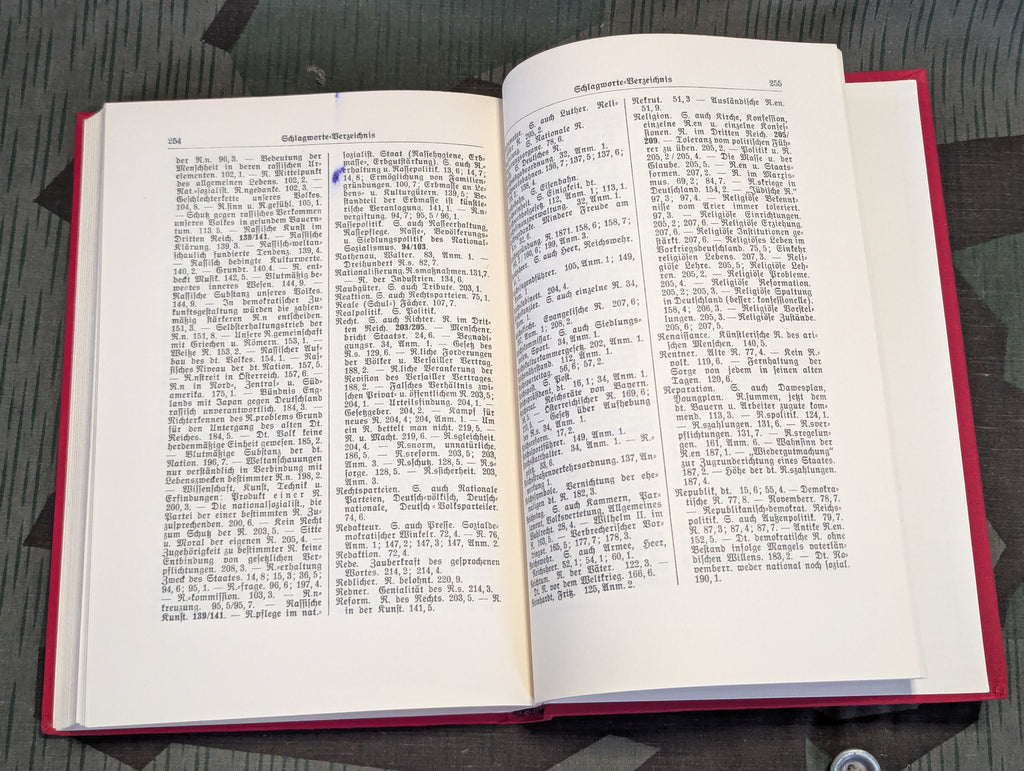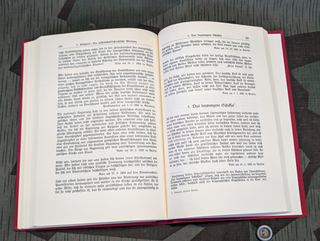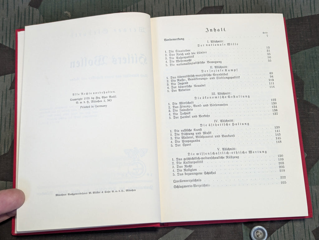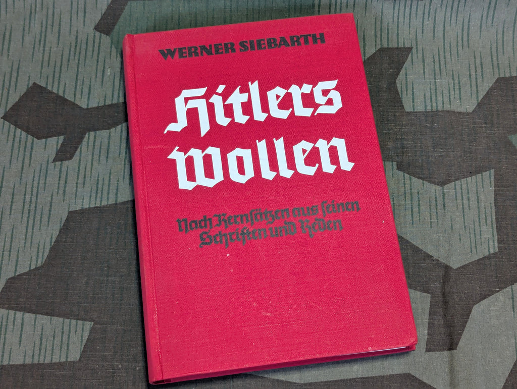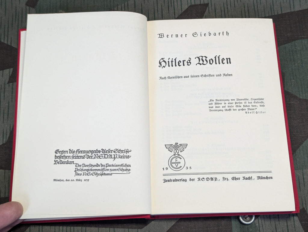 Original 1935 Hitlers Wollen book about what Hitler desires based on his writings and speeches. Printed by the Central Printing Office of the NSDAP. It is in rather good, clean condition overall. I did happen to see a small ink stain on one page when I was flipping through.