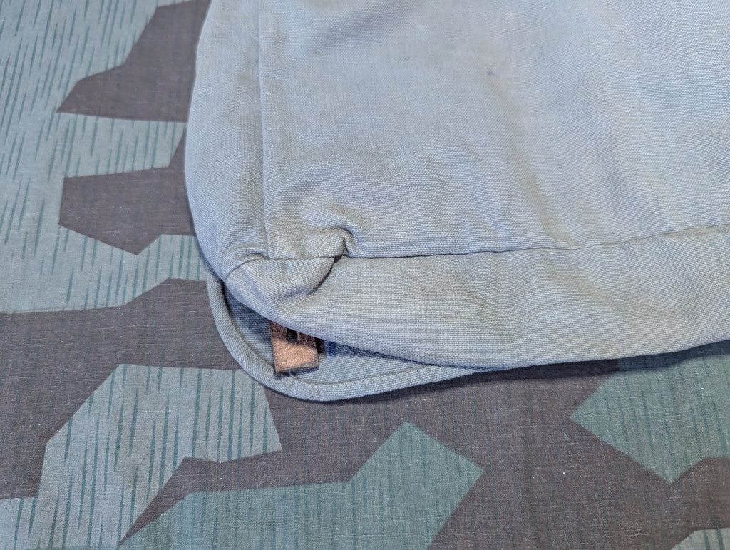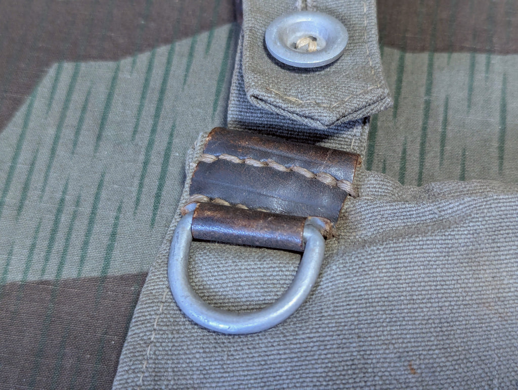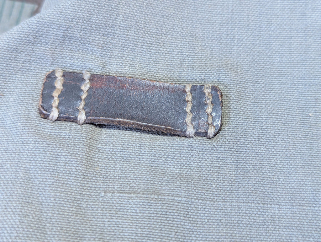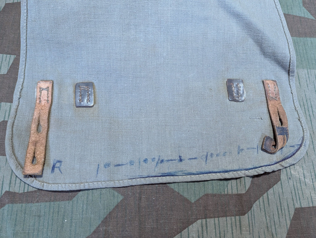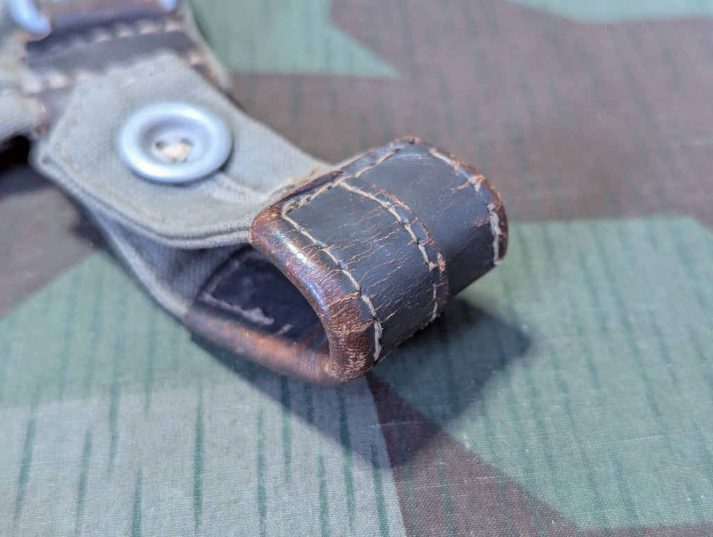 Original pre war M31 bread bag in fairly good used condition. The leather shows a little age and wear, but it is the really early style of leather which is a sort of gray - green color so that is always fun to see. There are some pen scribbles on the inside edge of the flap which are not visible on the closed bag. Overall this is a very nice used bag especially considering it is a fairly early version and a lot of the early gear was chewed up quickly after the start of the war. Some wear on the leather. This would be a great bread bag for a pre war or very early war mannequin.