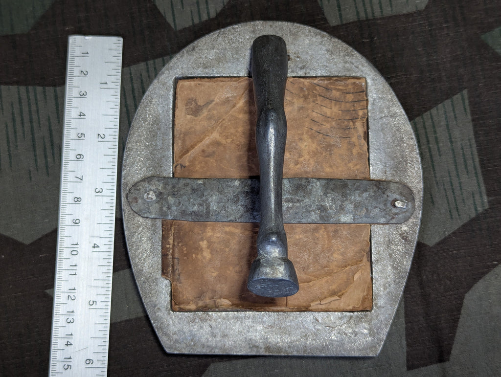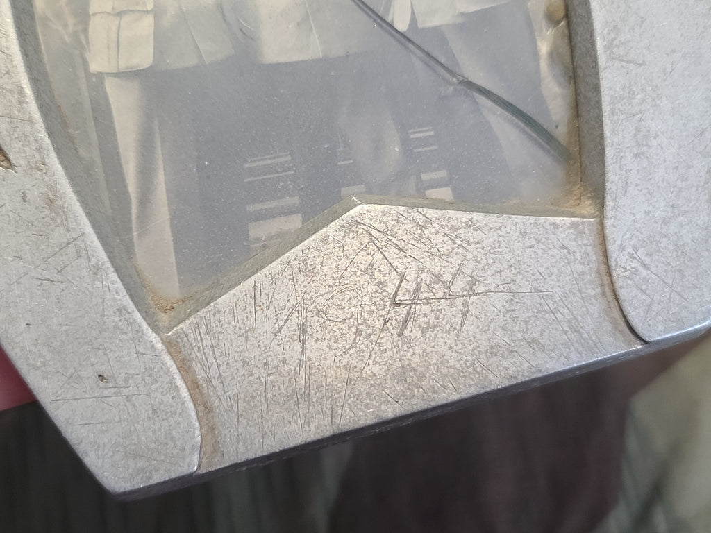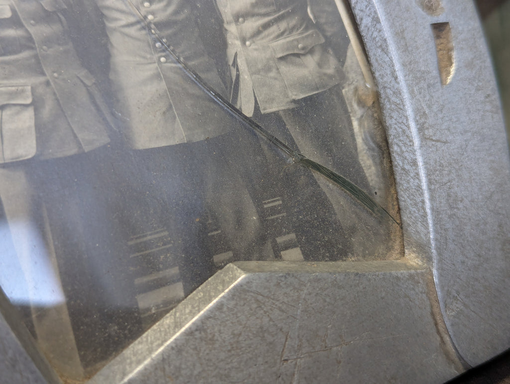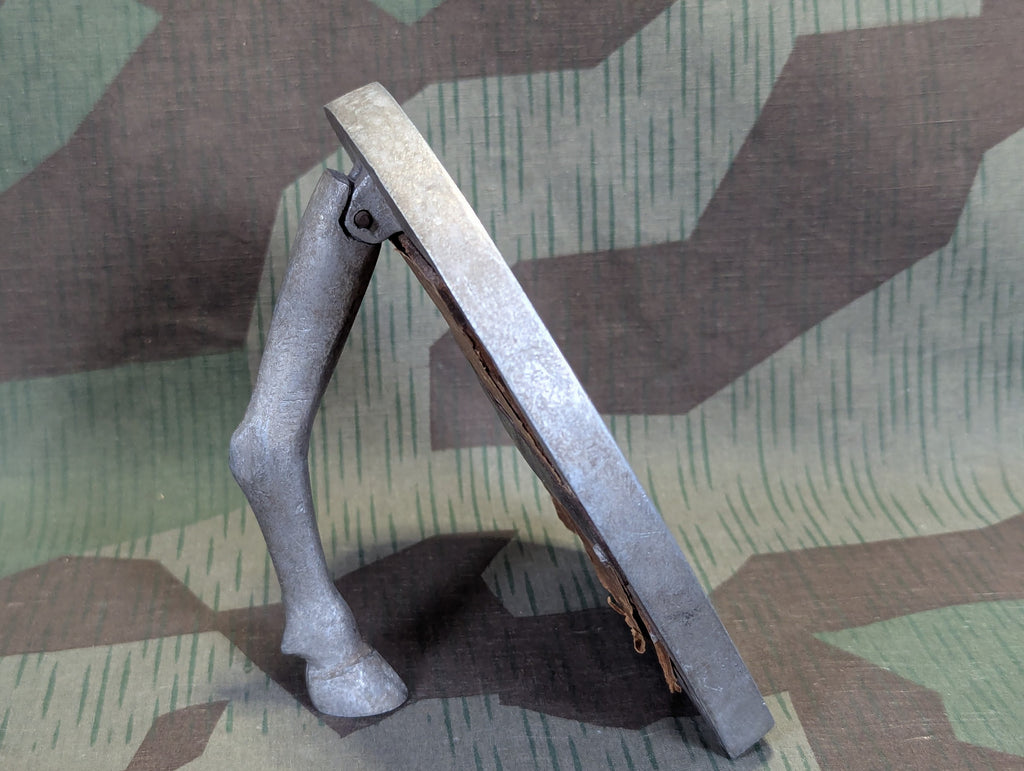 Very interesting aluminum or alloy picture frame in the form of a horseshoe with a horses leg as a prop to keep it up. The glass has a crack in it. It actually has a fair amount of wear. The leg support is ok, but it certainly could have been engineered better. There's looks to be 1944 carved on the bottom. Very interesting piece, I rather think it might be some sort of almost trench art piece although probably made by someone with skill in metal casting. The photo that is in it has been there for awhile.