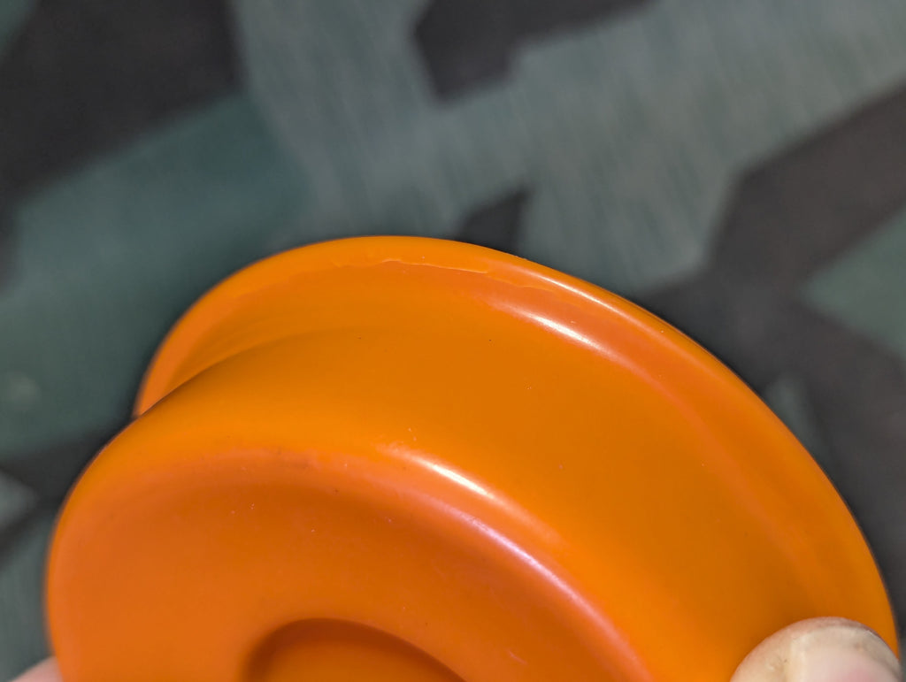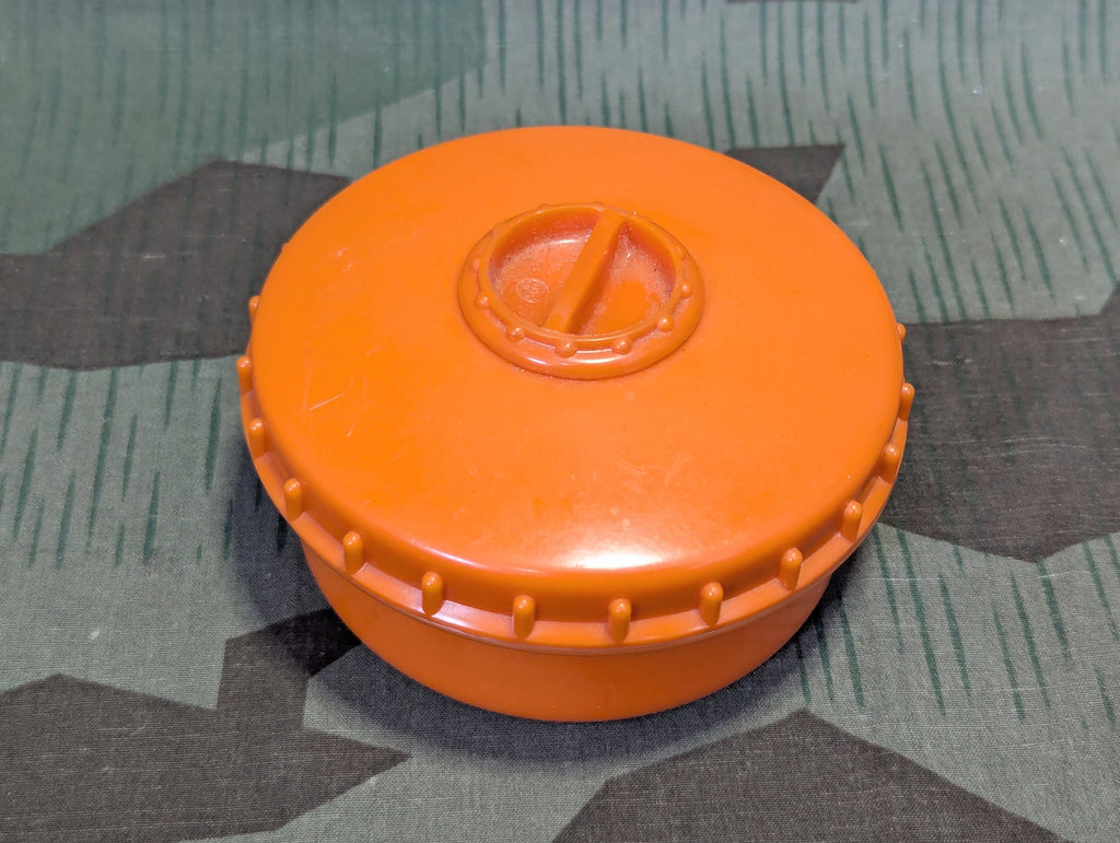 Original orange Bakelite (pollopas) salt container in very good condition. One of the best examples I have seen. Only very minor wear. Around the rim where the lids tightens down to, there are some lines which look like cracks, but these have probably been there since the day it was made due to internal material stresses. These lines are common in the orange butter dishes and similar items. It will be hard to find a better example than this. I will regret having sold this someday regardless of the price.