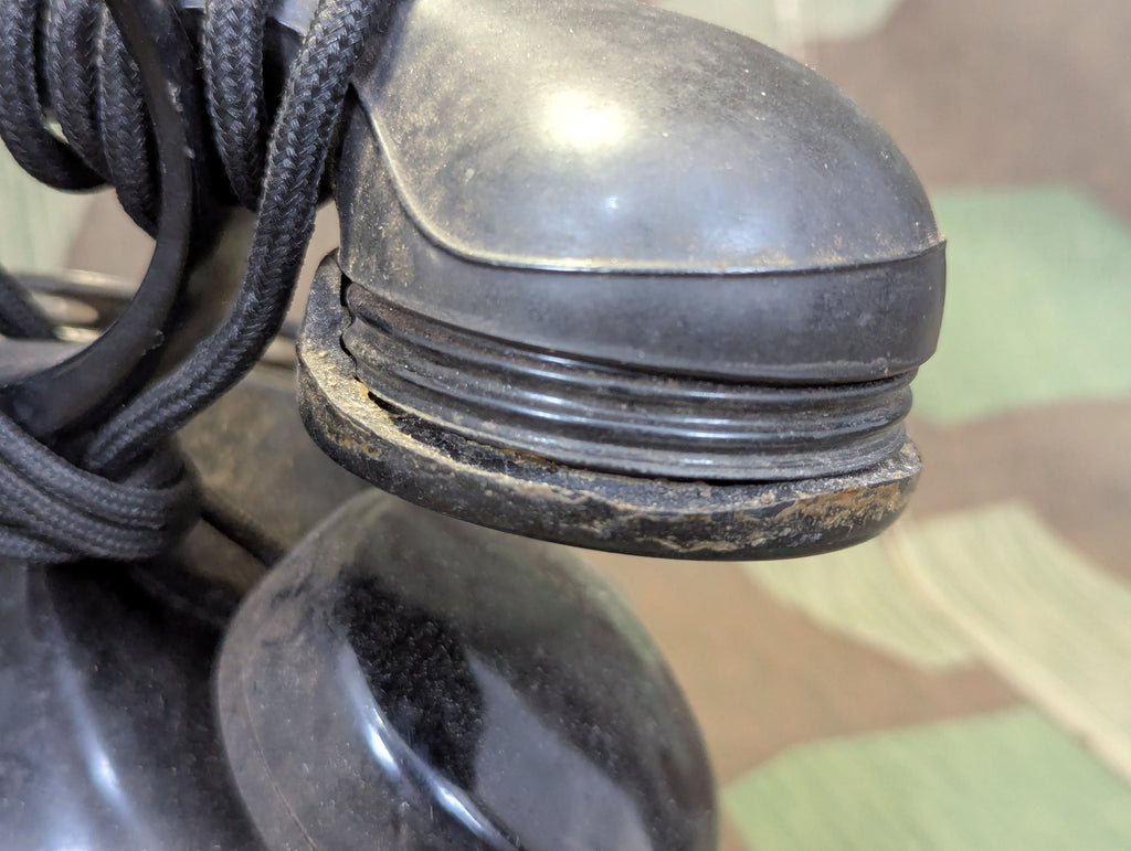 Original German W28 desk phone with the little wall box. This is basically the standard desk phone of the Third Reich. They did eventually come out with another model ,but I mostly see W28's. This one is a little rough. the handset is missing one cap and the other cap is broken. It is a project phone. This phone was so standard that they released new versions of it only every 10 years or so extending even out into the post war years. This is a pre war one. I believe the W38 replaced it in 1938 and then there was a W58 later. I might have numbers wrong there, I have looked at a lot of phones and I am just going off of my very fuzzy memory.