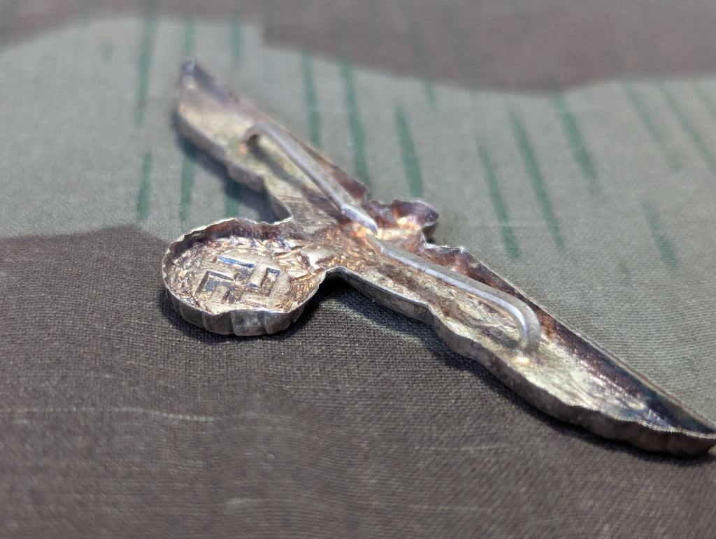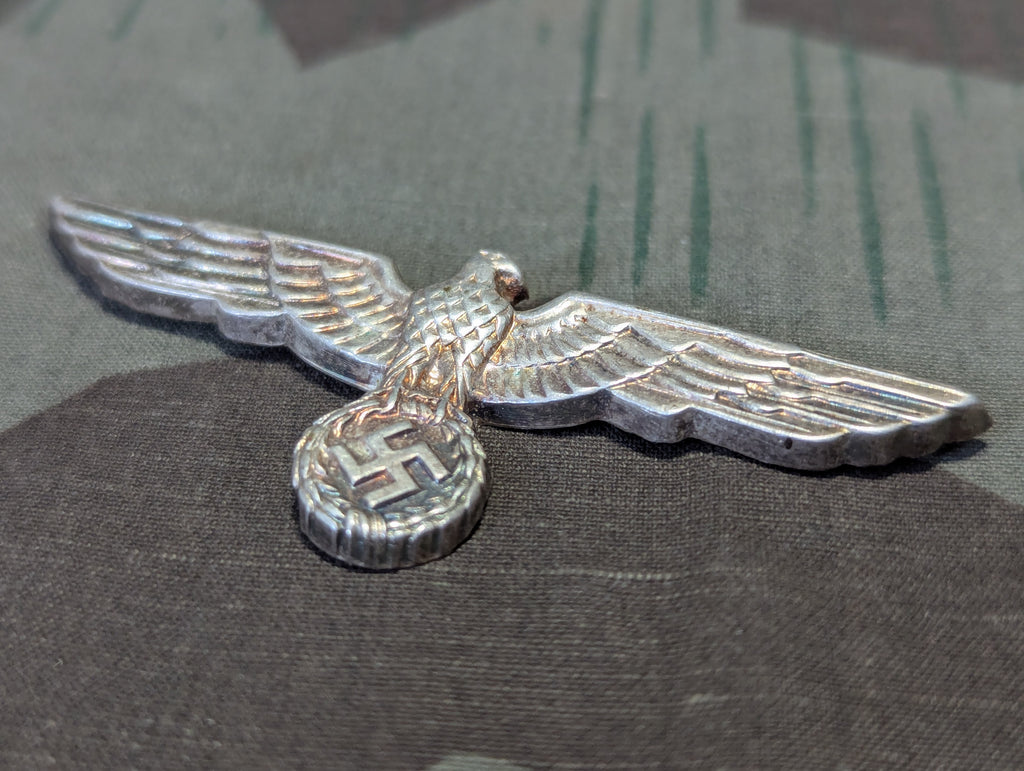 Original Wehrmacht officers visor cap eagle in decent condition. The prongs are intact, which is probably the most important part. The eagle is a little deformed and discolored. Small dent in one side of the wreath. The slight bend is subtle, I didn't even really notice until I started taking pictures.