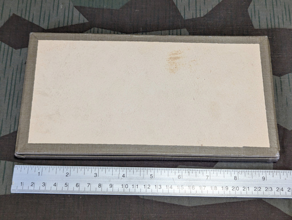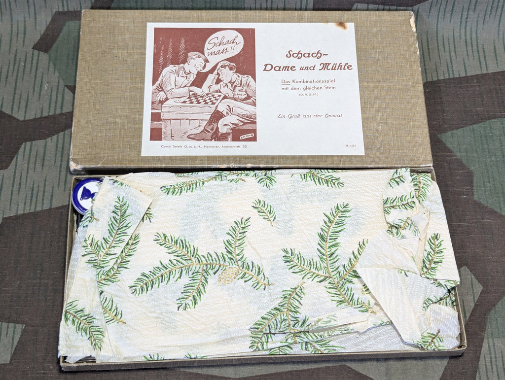 Nice original Wehrmacht game set. These were supplied to deployed soldiers as a greeting from the homeland. This one is in fairly good condition and it is complete. The box has a little light wear and some small stains. The pieces inside were packaged with Christmas paper. A very nice example.