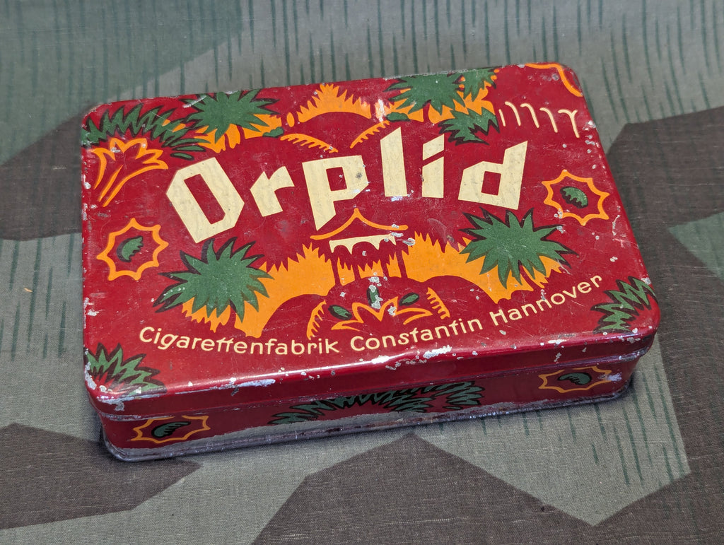 Fairly large pre war Orplid cigarette tin in OK condition. Nice colorful graphics. The tin has some light wear and bald spots on the sides, scratches and some dents on the lid. Originally held 100 cigarettes.