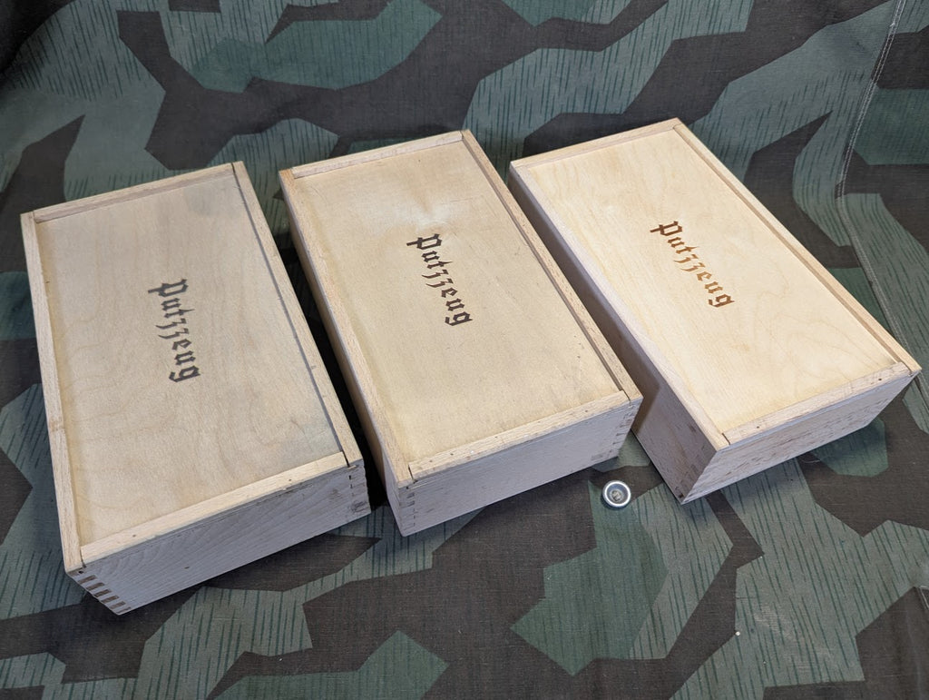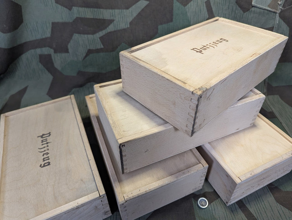The wood boxes are deadstock from a building clean out. These have been stacked up for many decades in storage. Some are a little dirty some have wood worm holes. I dug through a massive pile of these to find the best ones. Some almost look newly made, but I can tell you that based on the rotten ones I chose not to bring back, these really are quite old. The center of the stack just survived much better. I did also show the general variation in condition of these boxes, and the ones pictured in the listing are a good representation of what you will get. These are very similar to the cleaning kits which were made für Wehrmacht und Arbeitsdienst. Most of the brushes have had this marking added to them.