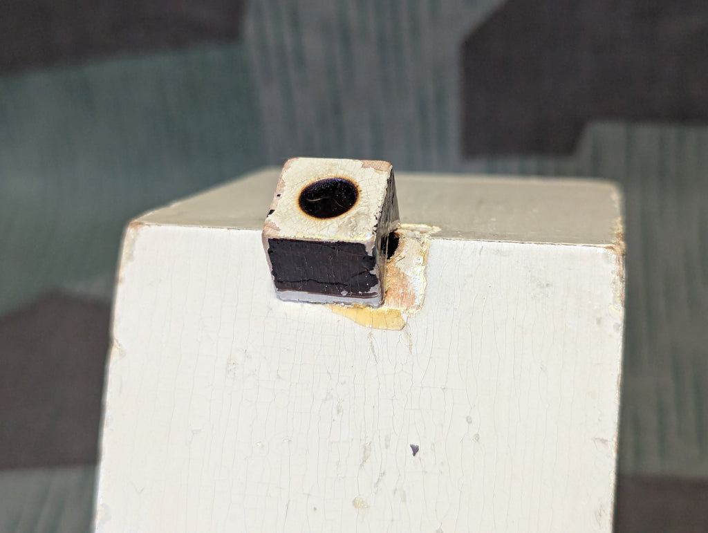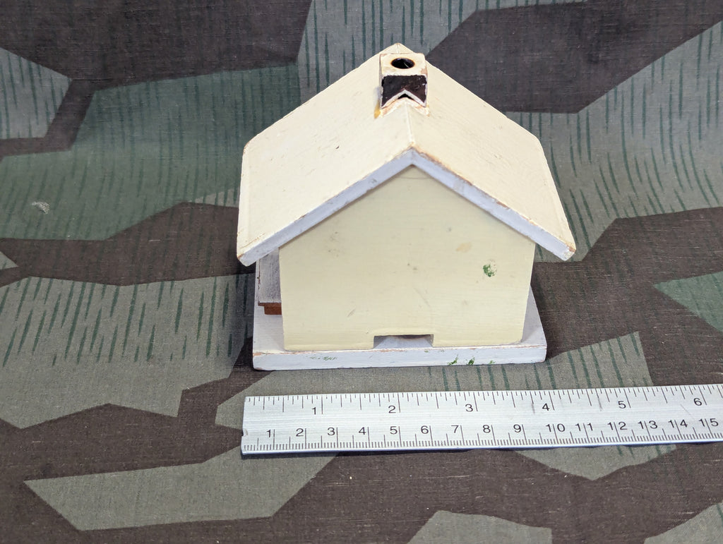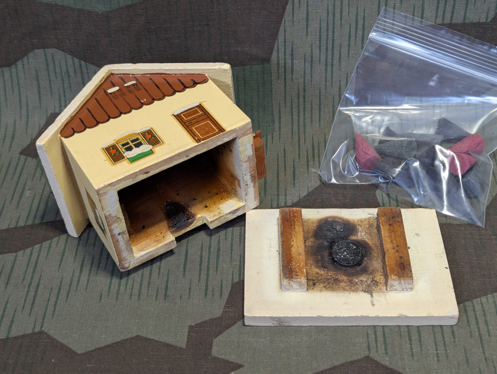 Nice older German Christmas decoration incense burner shaped as a house or cottage. Its in decent used condition with one repair, the chimney was glued back on slightly out of place. You may want to move the chimney back if you want to use it. It is vintage but postwar. In good condition with just a nice old patina. It is a mix of hand painting and decals. Comes with a small bag of mixed scent incense cones (Weihnachtsduft, etc.)