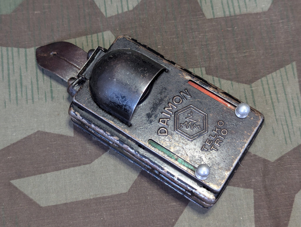 Original Wehrmacht style flashlight with a red and green filter. The flashlight is in working order and the leather button tabs are still there and nice. This one still has the flap cover for the light, but it is missing the little sliding cover which went over the on off button. There is some corrosion on the inside and general wear and age but is still a solid flashlight. It does not come with a battery. This is a pretty good example overall.