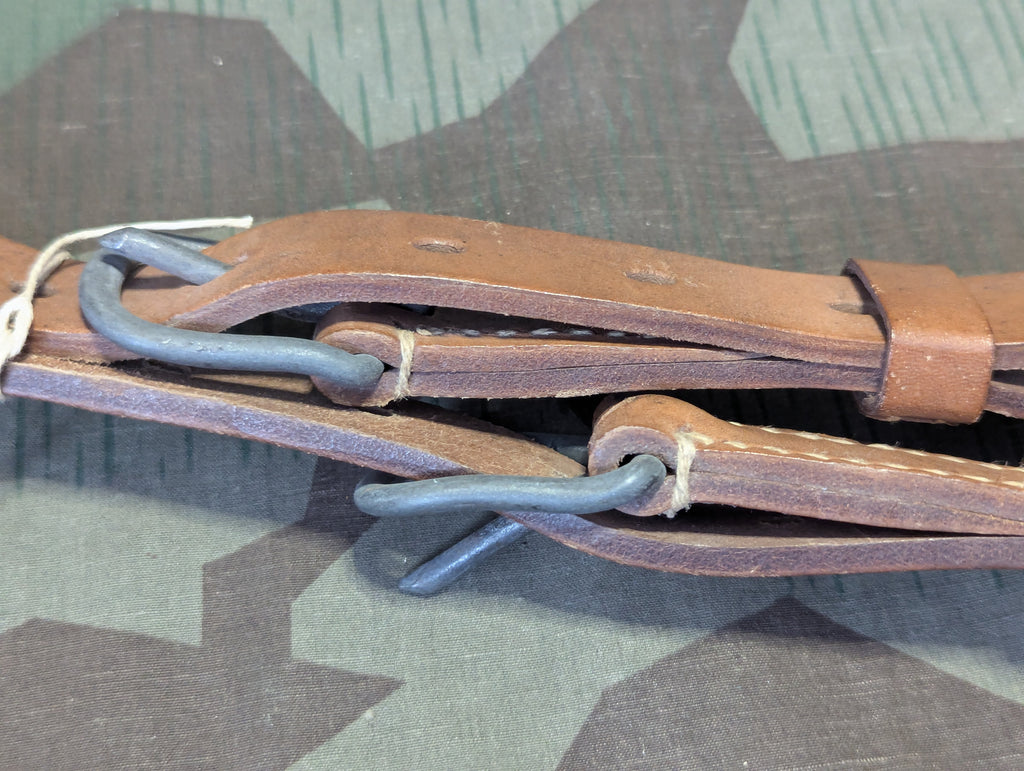 Stunning unissued original leather strap set for the essenträger food container with and R.B.Nr. ink stamp. These are in extremely good condition for being 80 years old. They had to have been stored inside something. You can tell they are old, but they are still rather like new. They are tied together with some string, I am not 100% sure the string is original but I left it the way I found it, just in case. You can't go wrong with this pair of straps. I don't think it is even possible to find a better example. Having them around has certainly made my life a bit more enjoyable.