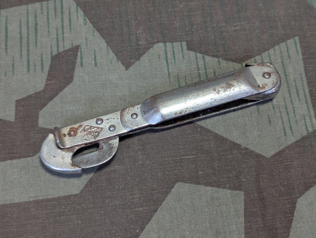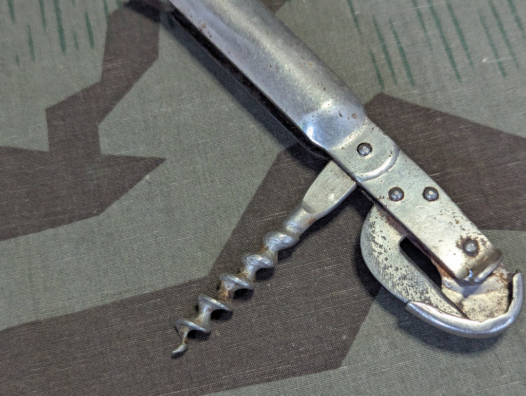 Unusual can and bottle opener with a fold down corkscrew. It has folding covers at either end to cover the poky bits although the one on one side is kinda floppy. I think it might actually be Russian based on the markings, but I already took pictures on a German background so it is what it is. I found this in Germany, It is probably post war.