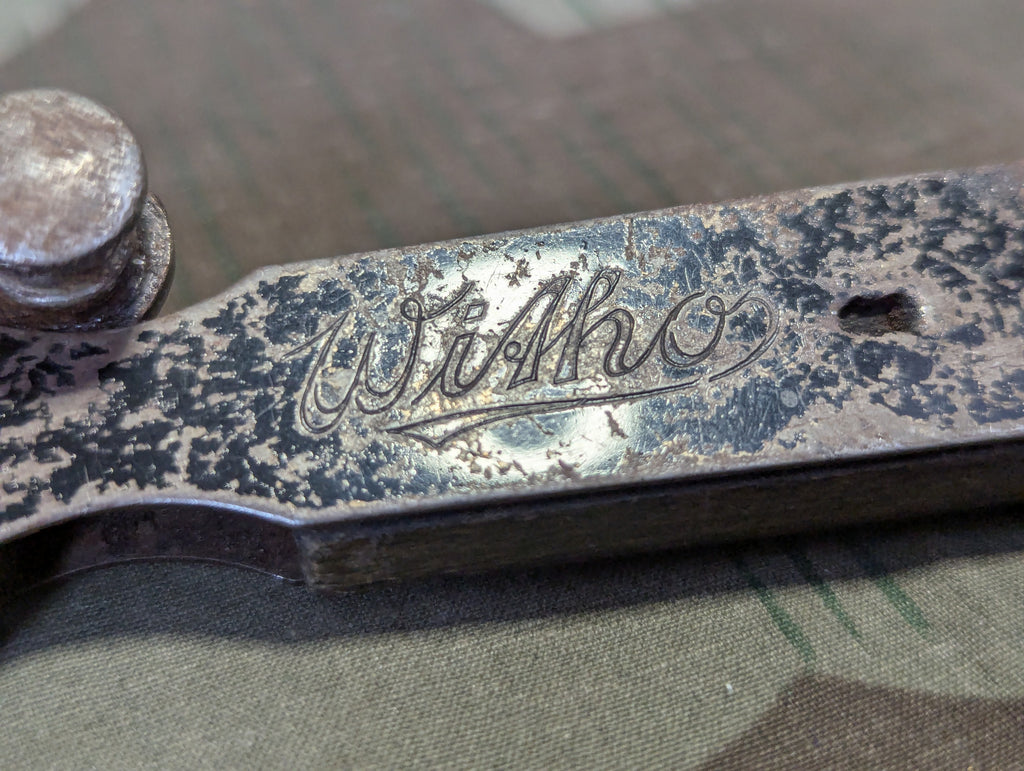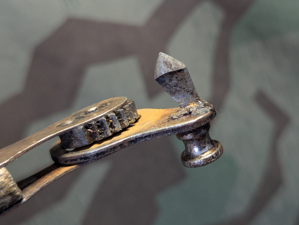 You shouldn't be without one of these! German can opener that works completely different than American types. You force the cutter through the can, then drag it around the edge. This design was popular in Germany for a long time and cheap crappy versions are still available in stores. This one is the older construction, made from steel and wood. It is in fair condition with some wear and rust. It needs cleaned up but should still be decent for using.