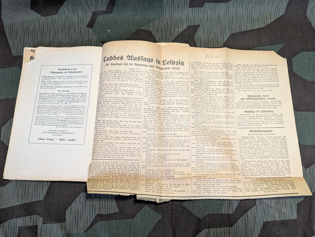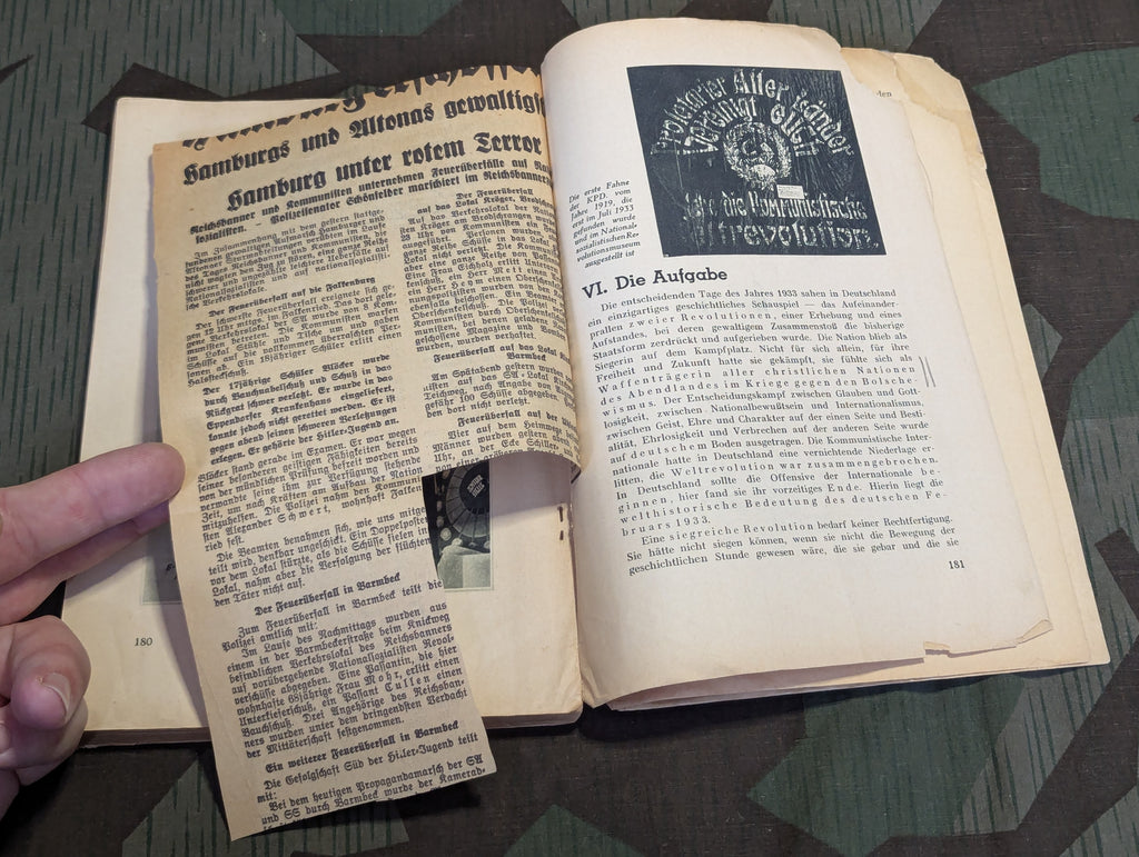 Original 1933 anti-communist book in well used condition with a number of newspaper clipping additions, like a book you might find used to level a table leg in a conspiracy theorist's string room. They even used some paper to repair damaged pages. This is an odd book, and I mean this exact one specifically. There is even an English newspaper article in the back of the book. The spine and cover have some damage as do some of the pages.