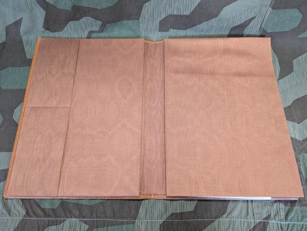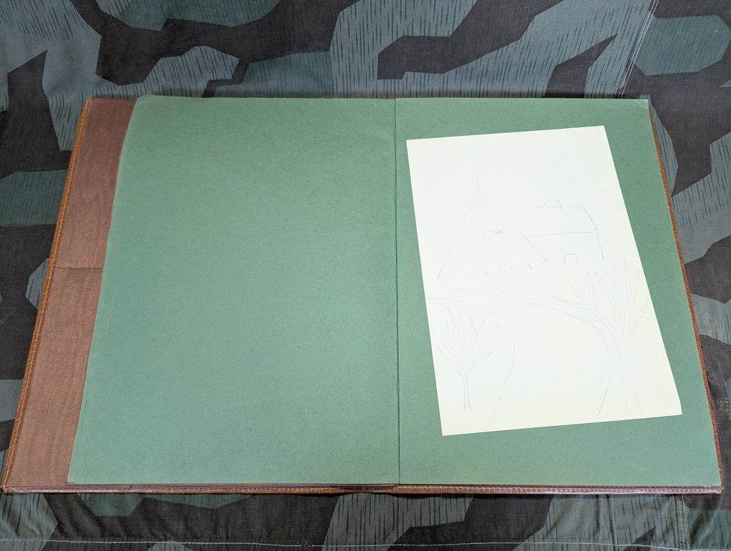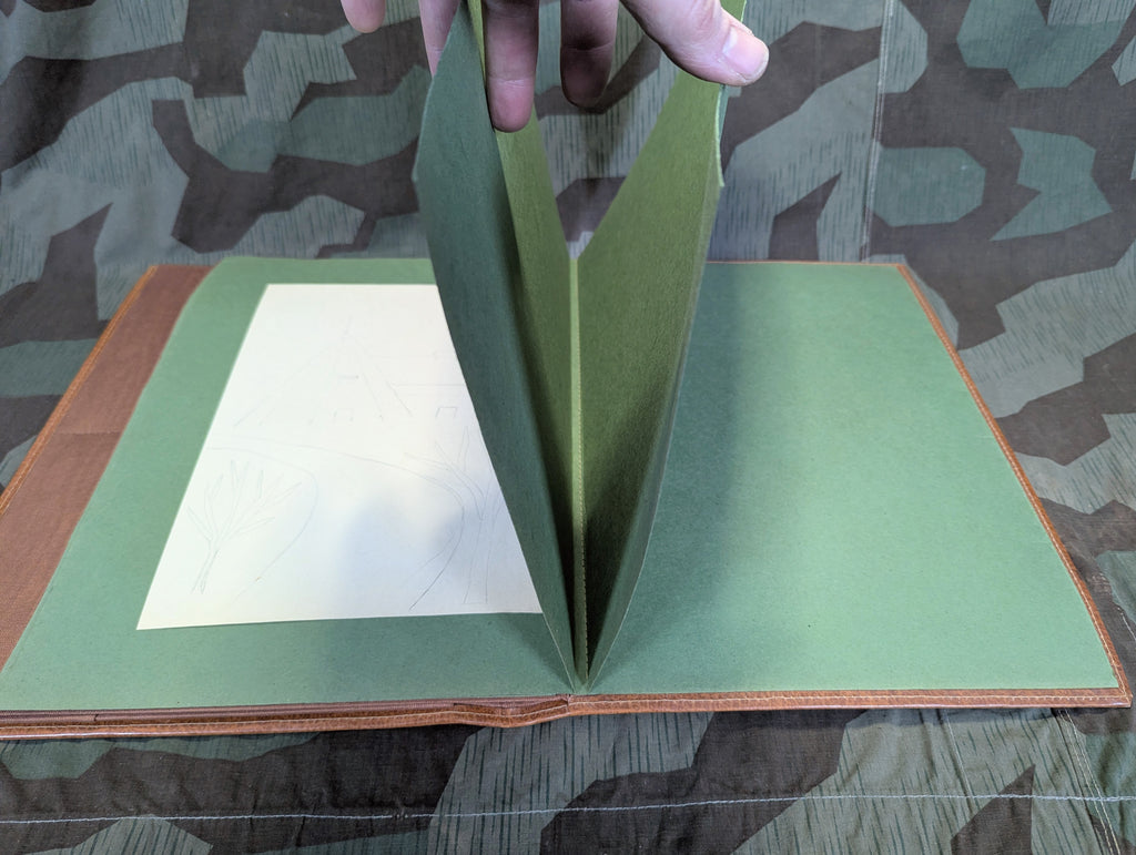Vintage German desk blotter with a deeply embossed ship motif. It appears to be made from some form of early vinyl or similar material, but it is much higher quality than you will be thinking when you read that. It is basically unused with only some minor storage wear on the high points of the the embossing. It has a number of green folder sections along with some pockets upfront, usually used for stationary or envelopes. The only thing which this appears to have ever been used for is storing one unfinished sketch of some trees, with a building and a Teepee in the the background. Yes, the sketch is included, I could not rob this beautiful blotter of its only purpose in life so far.