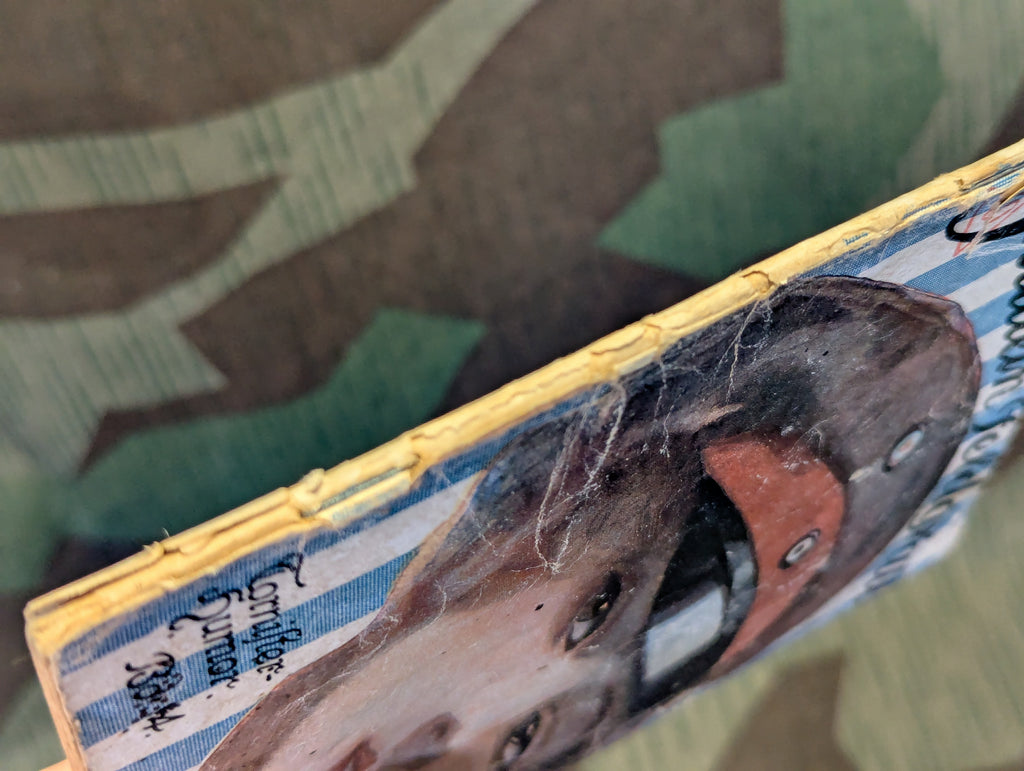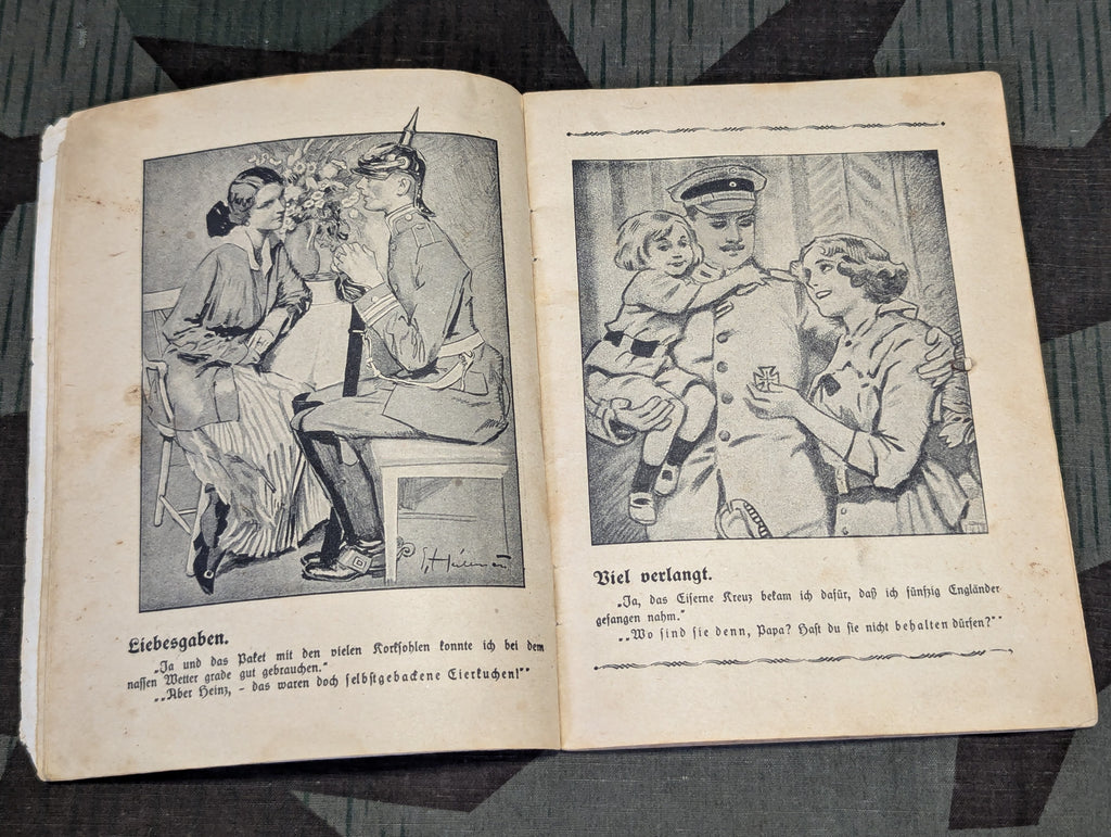 Original Fraulein Feldgrau tornister humor booklet. The condition is a bit rough. If poorly handled, the cover would probably come off. The pages are yellowed and stained. The cover is faded and worn.