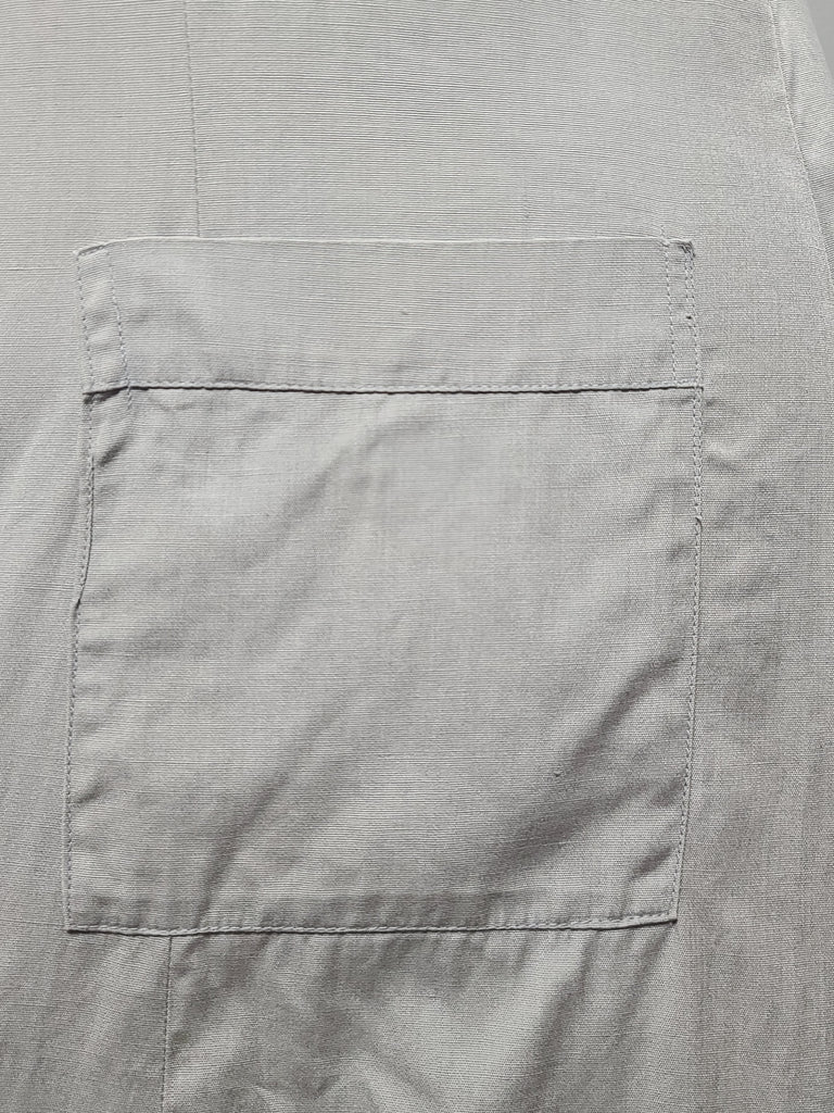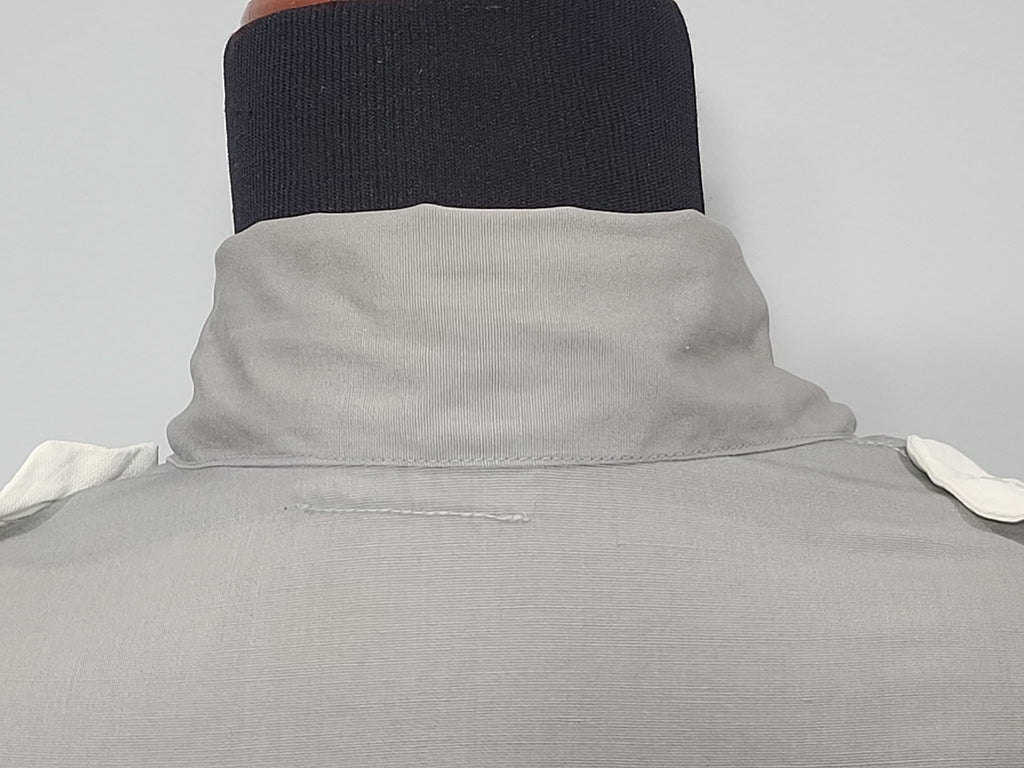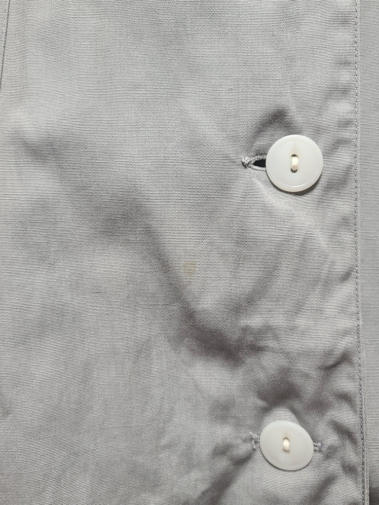 Made of cotton. The shoulder epaulets and cuffs button in and are removeable. Missing the belt. Overall fairly good condition - it does need a cleaning (I didn't have time to launder it, so selling it as-is - it wouldn't take much to freshen it up). Overall discoloration / age. There is some light staining under the arms. Small brown stain on the chest and another by the buttons on the skirt. The white cuffs have some light staining as well.