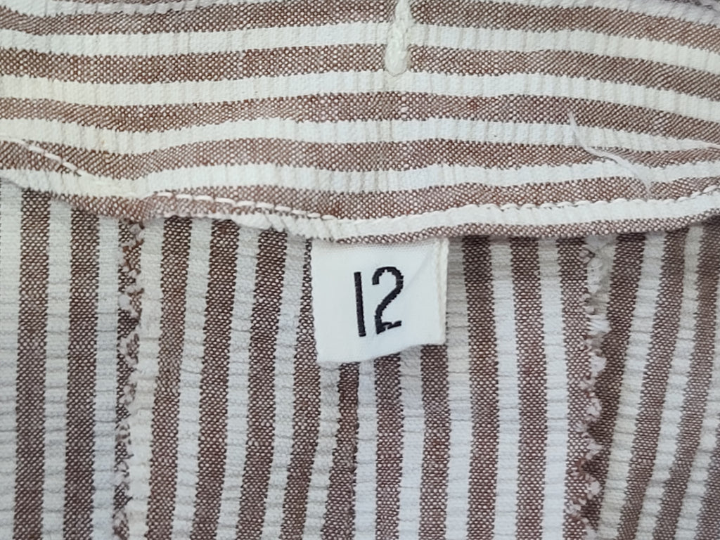 It is labeled a size 12 (check above measurements to ensure fit). Nice clear label. The tag inside is dated 1943. Overall very good condition. Inside, where the cotter pins attach to the buttons, there is some yellow staining; this is not visible on the outside. There are some pulls in the material and very very light staining in places (epaulets and sleeves).