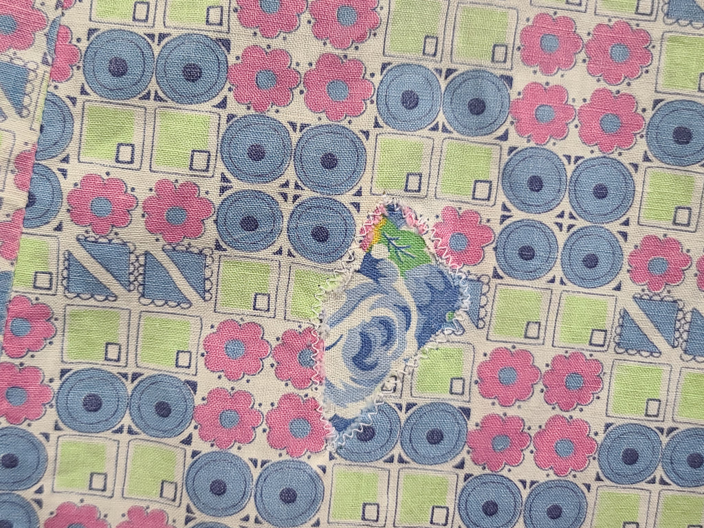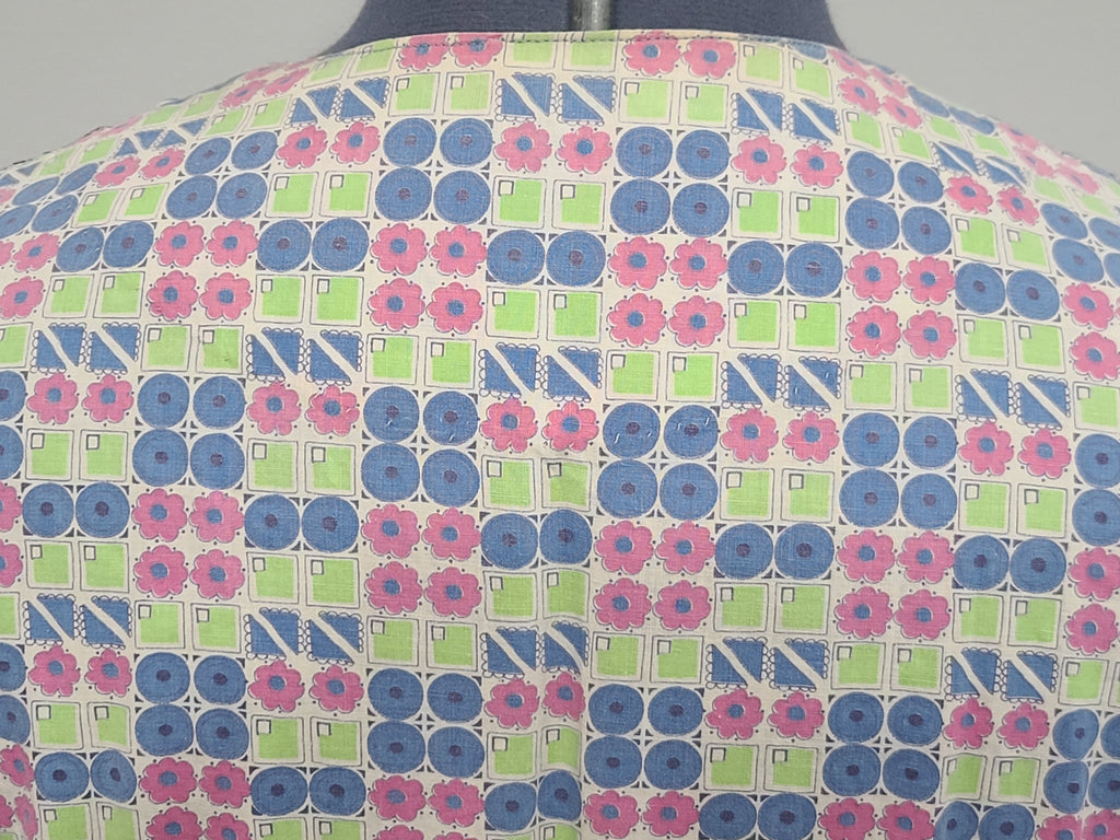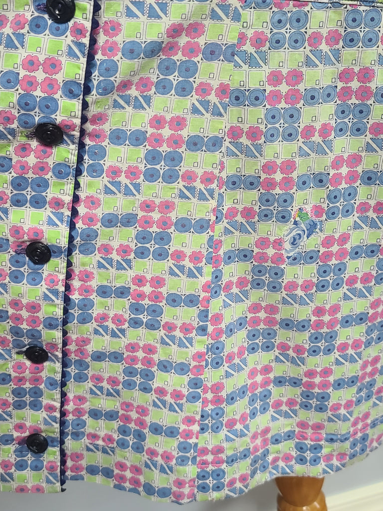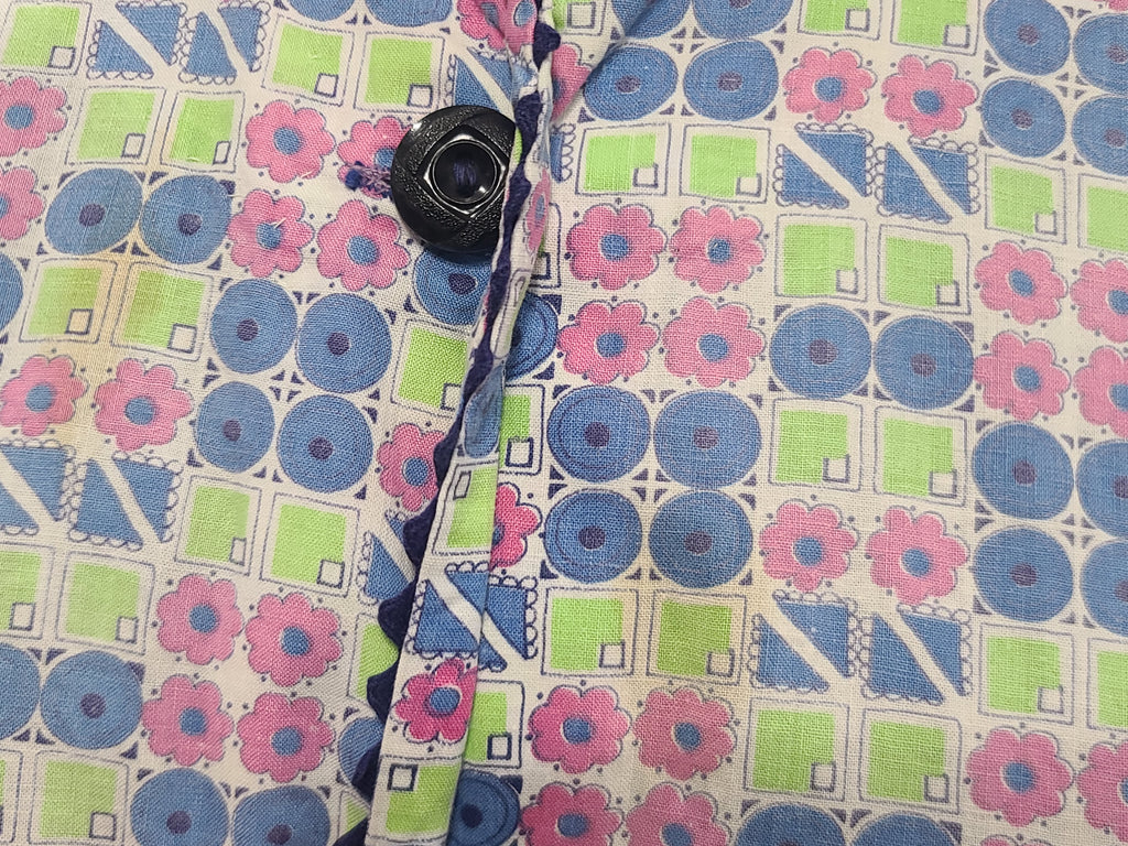 Buttons down the front. Attached ties at the sides. Pockets. Decent shape- wearable, but with flaws. Some overall fading throughout. Small stains near the top buttons. Repairs in the skirt and on the hem (the material used to patch them is a completely different print, yet it does sort of blend in.  Repairs and some small tears by a few buttons. The last photo shows the un-faded print next to the most faded area.