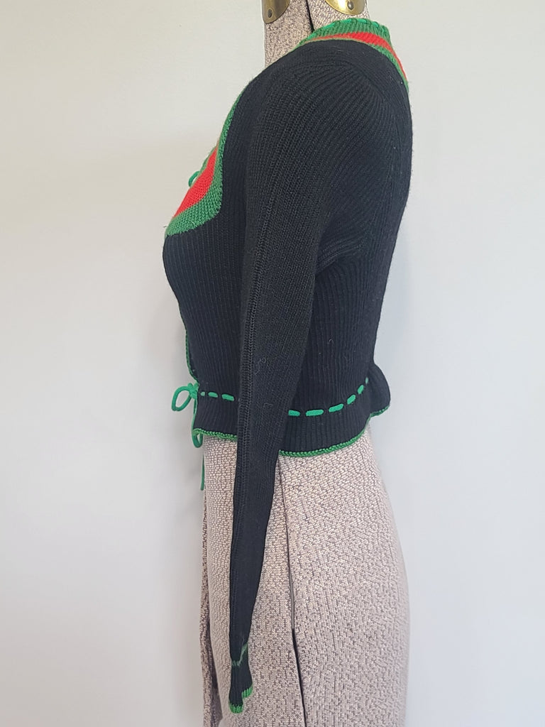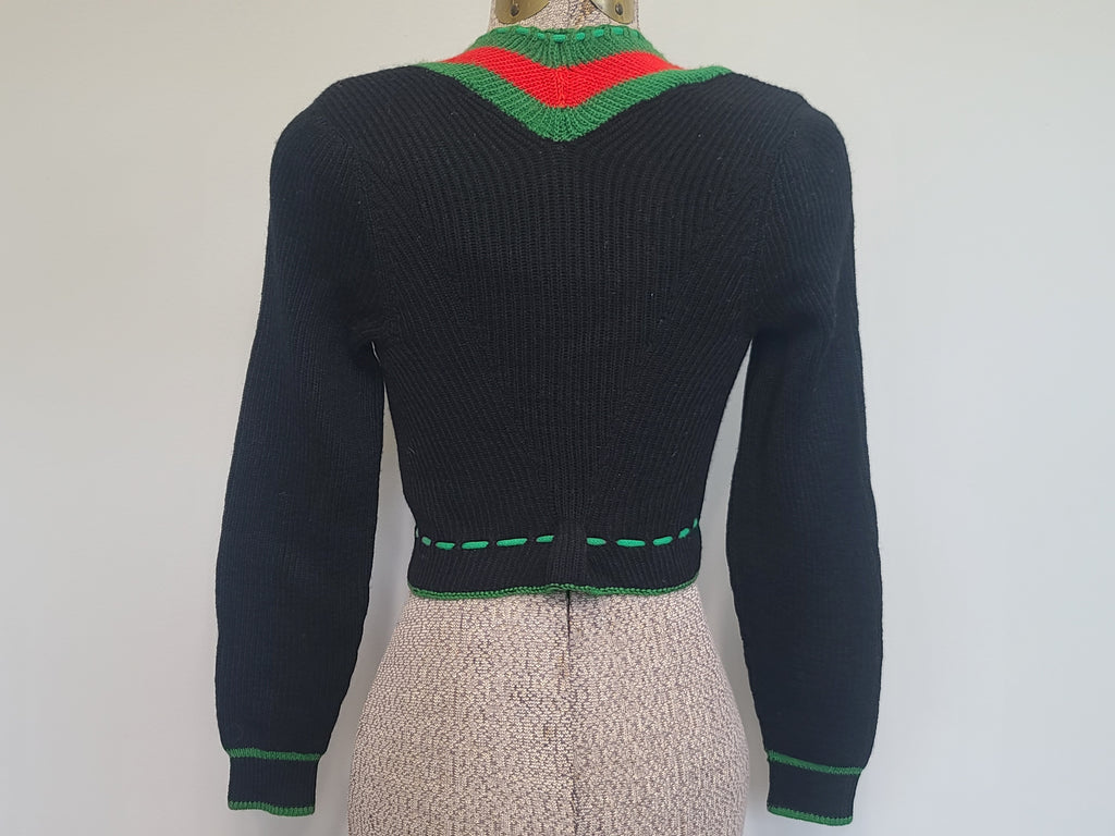 Nice black wool knit sweater with green and red trim. Metal buttons. Green ties at the collar and at the waist. The waist is tailored in to give it a flattering look. Super cute sweater that gained popularity in the 1930s and was made for many decades after. It was popular with the BDM (Bund Deutscher Mädel - League of German Girls) as well and was an approved garment for certain regions.
