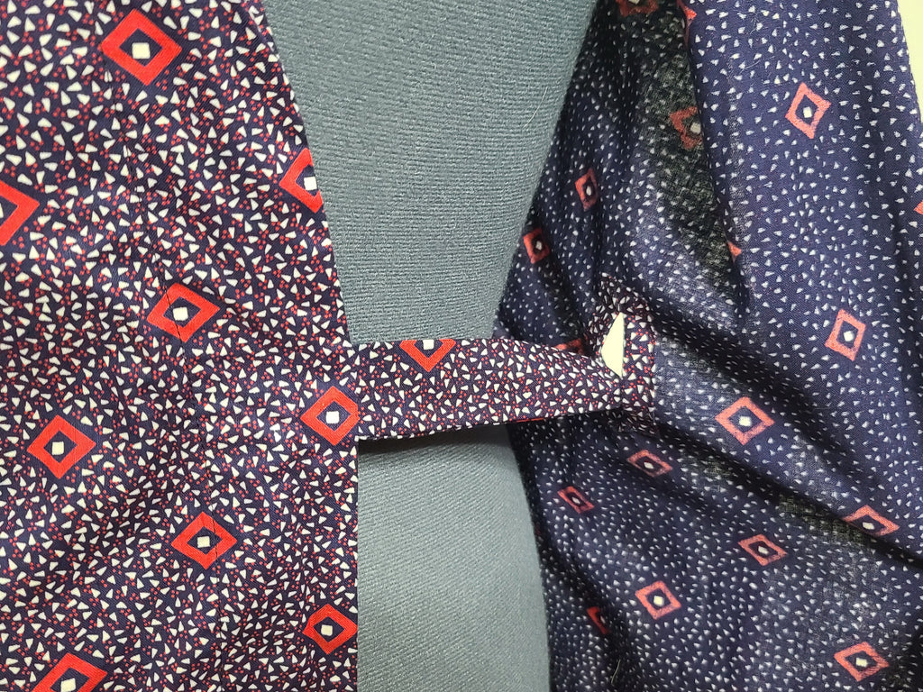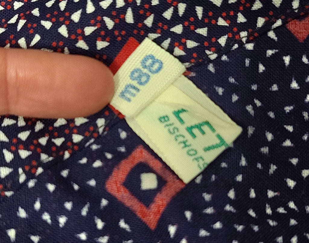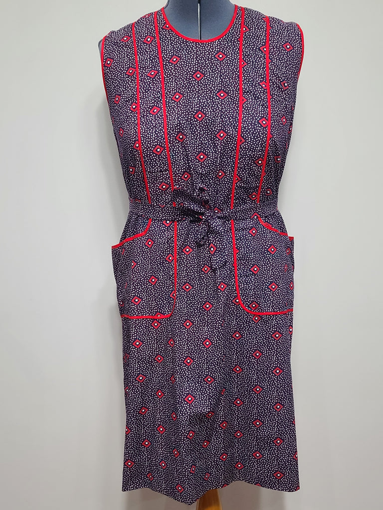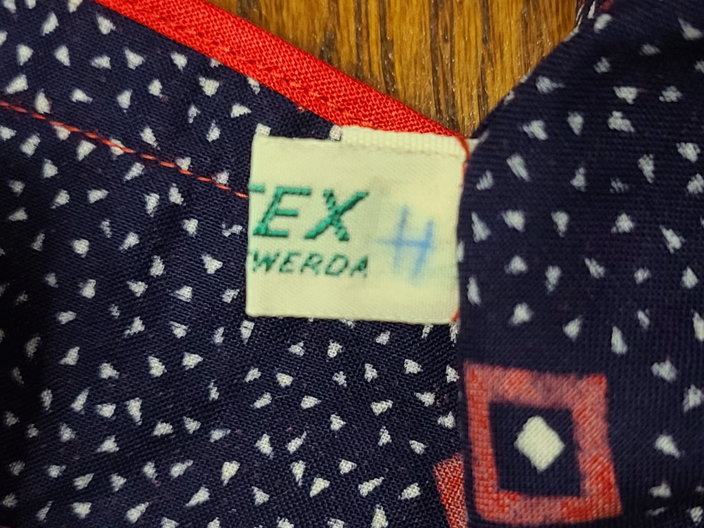 Cotton print wrap dress with large pockets. This is East German, but the style dates back to the late 1930s. This could be worn as a house dress or as an apron over top of a regular dress to protect it when doing housework. There is a single button it the back. On the side, there is a special hole to put the tie through; the ends wrap around and are tied in the front. The back sides overlap, but there is nothing to pin them closed - meaning it can open up depending on how you move. Good condition overall. There is stitching on the sides that make it look like the dress was taken in slightly.