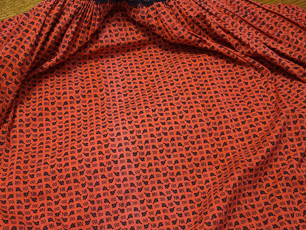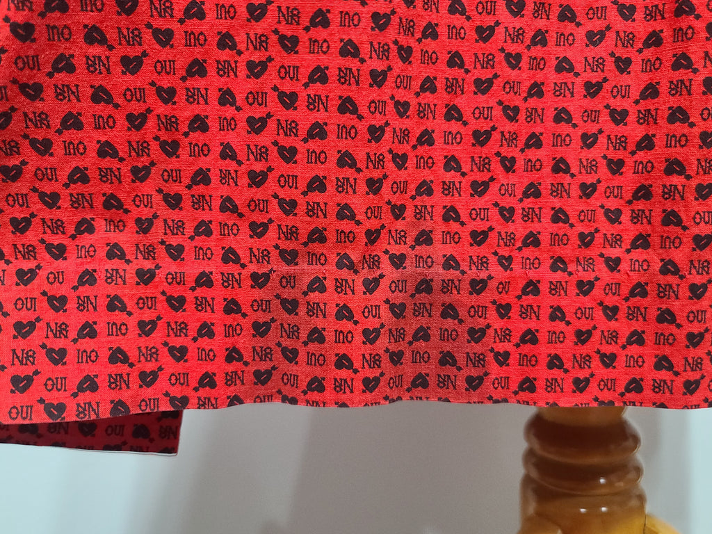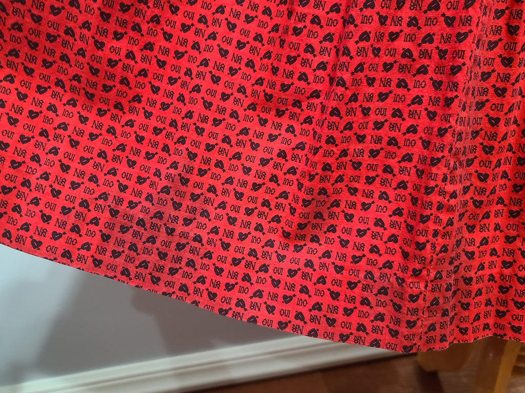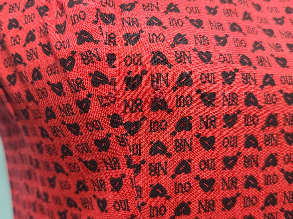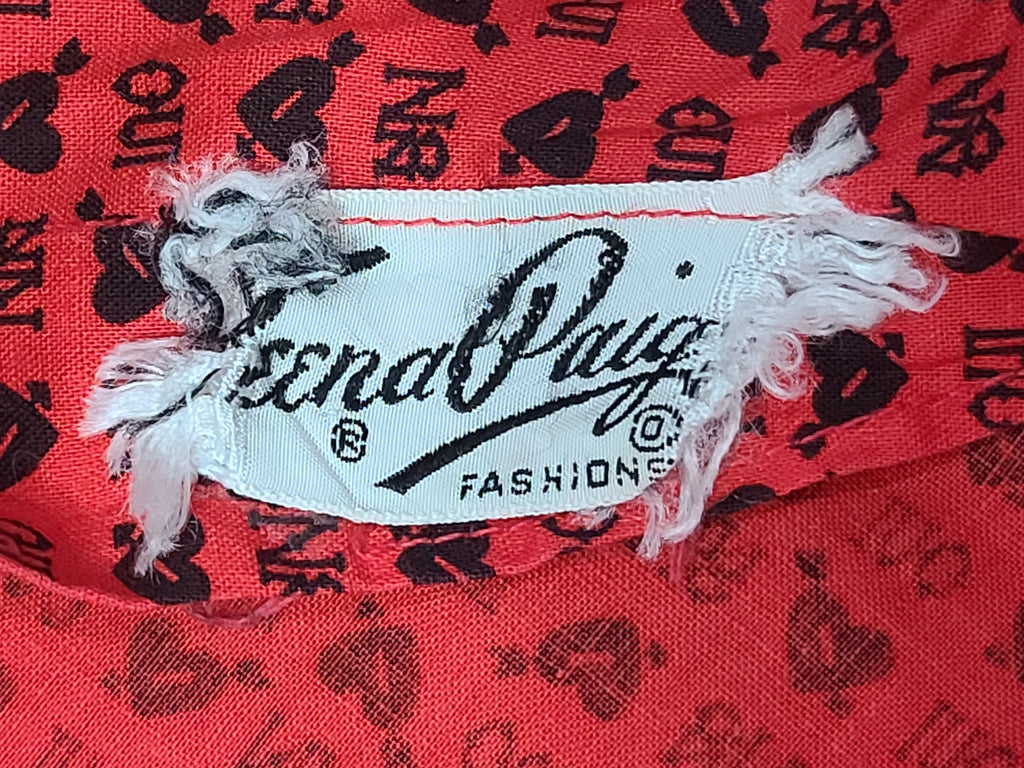 Lovely oui/non (yes/no) print with a heart and arrow. Bright red. Full metal back zipper. Teena Paige Fashions label (fraying). The dress is in OK condition. There is some staining and fading throughout. The folds in the skirt sort of hide some of it. The stains around the hem are the most noticeable. There are a few small repairs (one by the zipper and one on the chest). The zipper is handsewn in and seem to sit slightly off (not really noticeable). Some fading under the arms. I took some photos of it laying flat to highlight the fading and staining. Still wearable as-is.