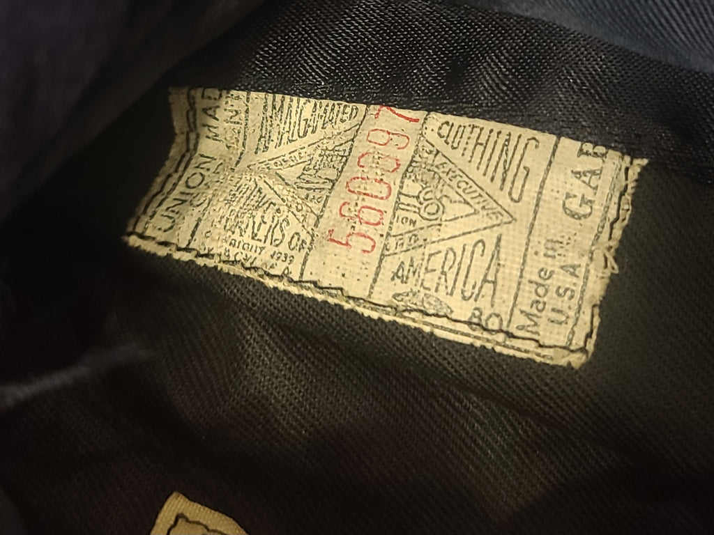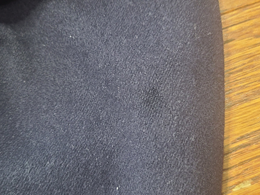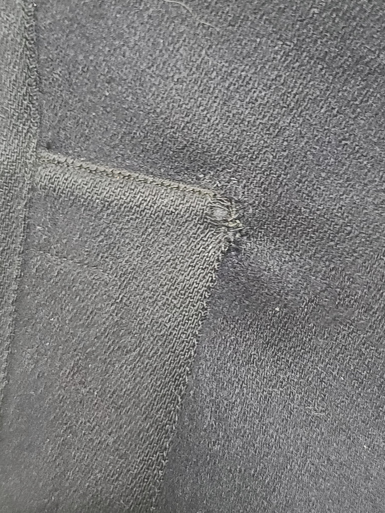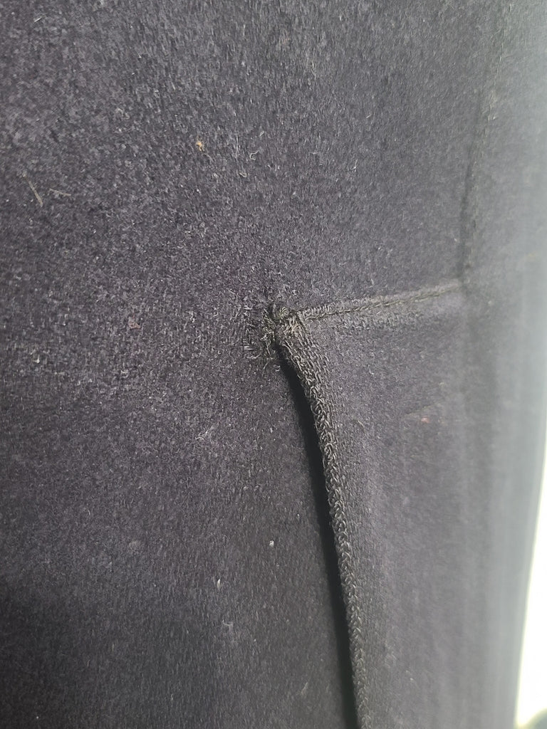 Nice WAVES labels inside. Marked a size 18. The coat is a heavy navy blue wool. Cinched in the back. Overall good condition, but there are some minor issues and general wear. Repairs on the top corners of both pockets. Some spots where the material is worn thin. Wear on the ends of the sleeves.