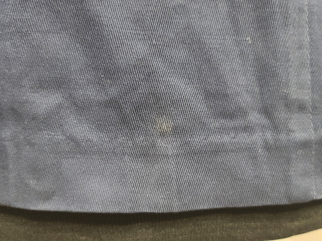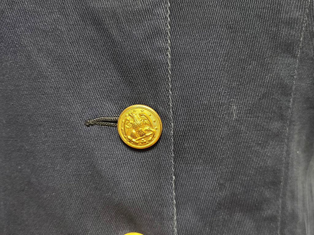 It is in good condition overall, but does have some flaws. There is some overall general wear, most noticeable on the sleeves. Some pulls in the material. A couple small stains. The buttons are held in place by cotter pins.