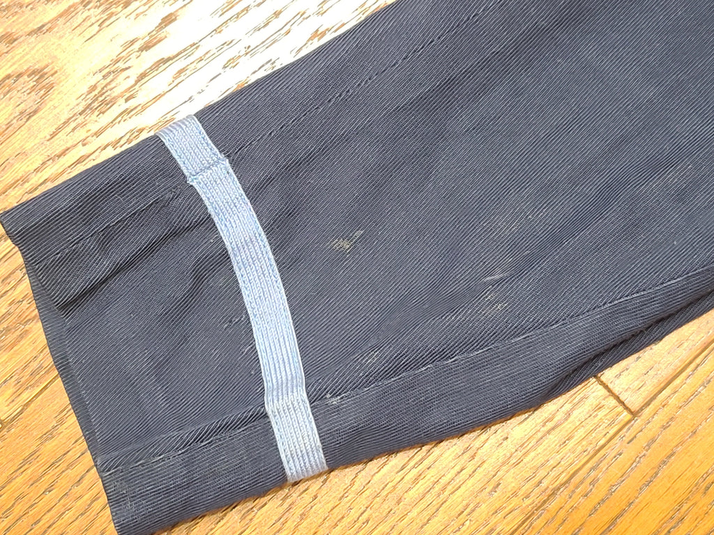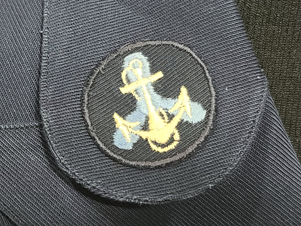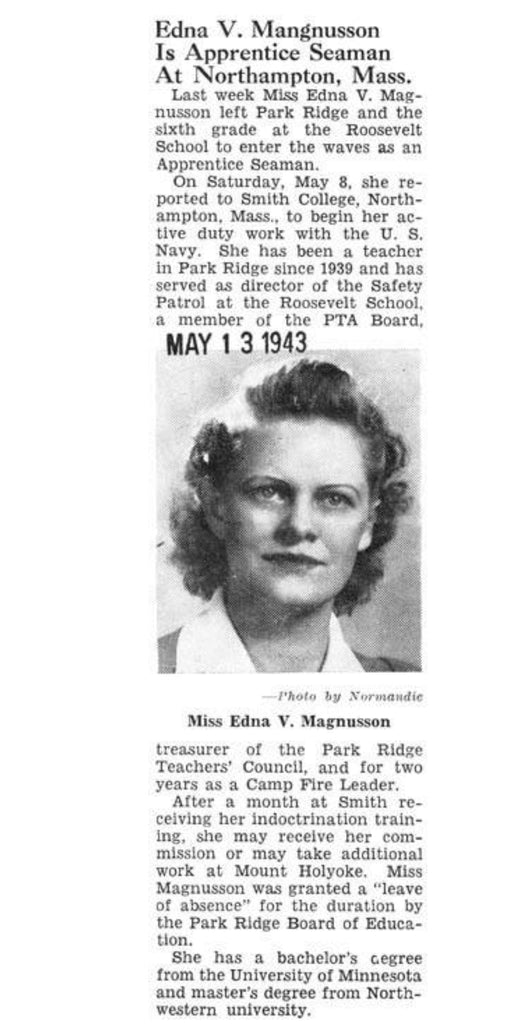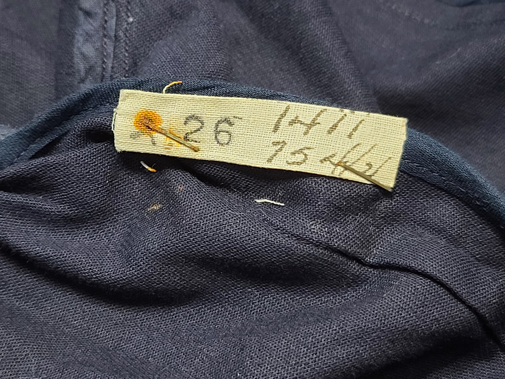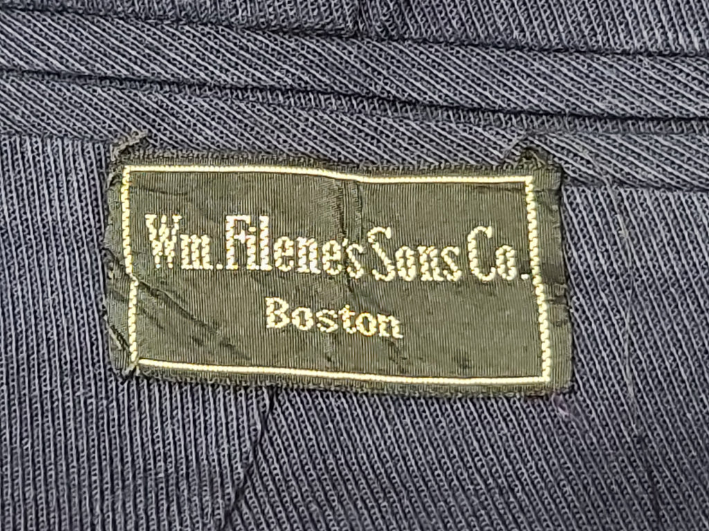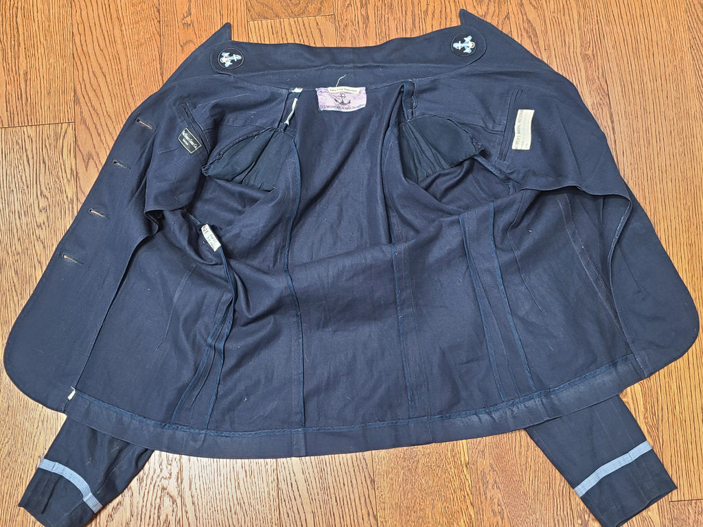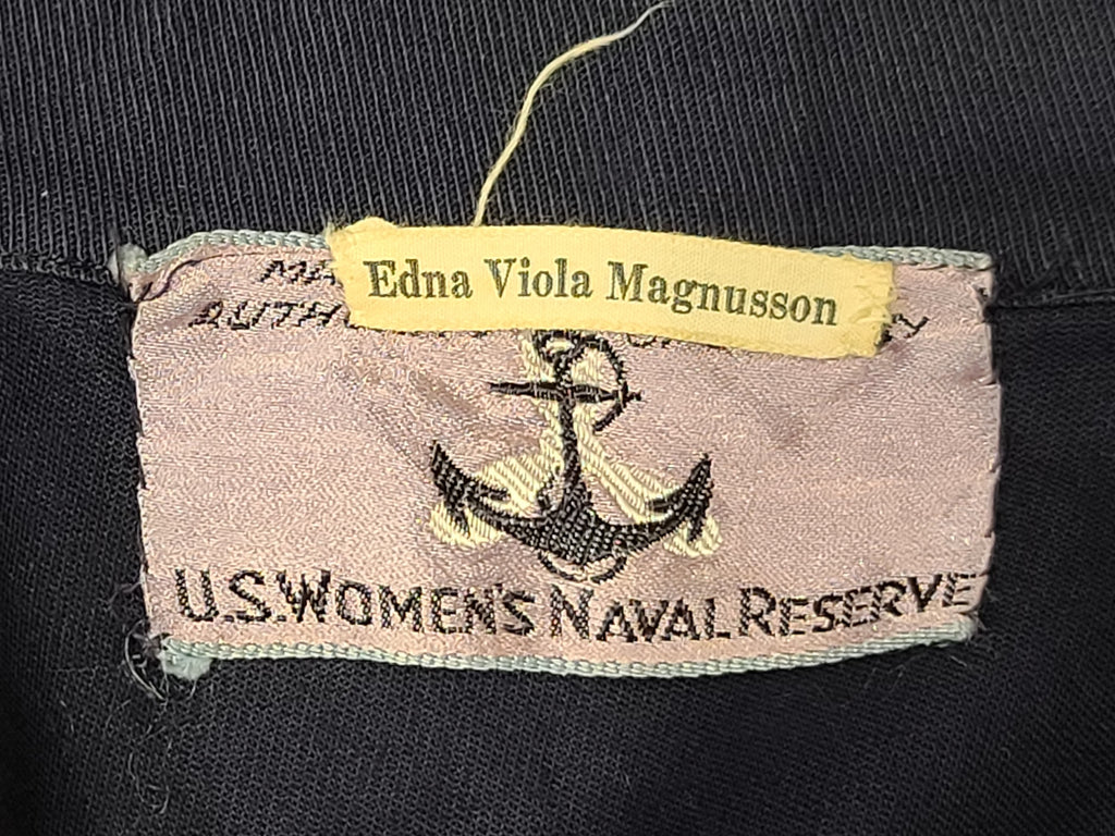 It has the blue "Made and sold under the authority of the U.S. Navy U.S. Women's Naval Reserve" tag. Named to Edna Viola Magnusson. On the pocket inside is the Women's Naval Reserve label with lines for name and rate as well as a tailor's label from Wm. Filne's Sons Co Boston. Small size 16 tag.