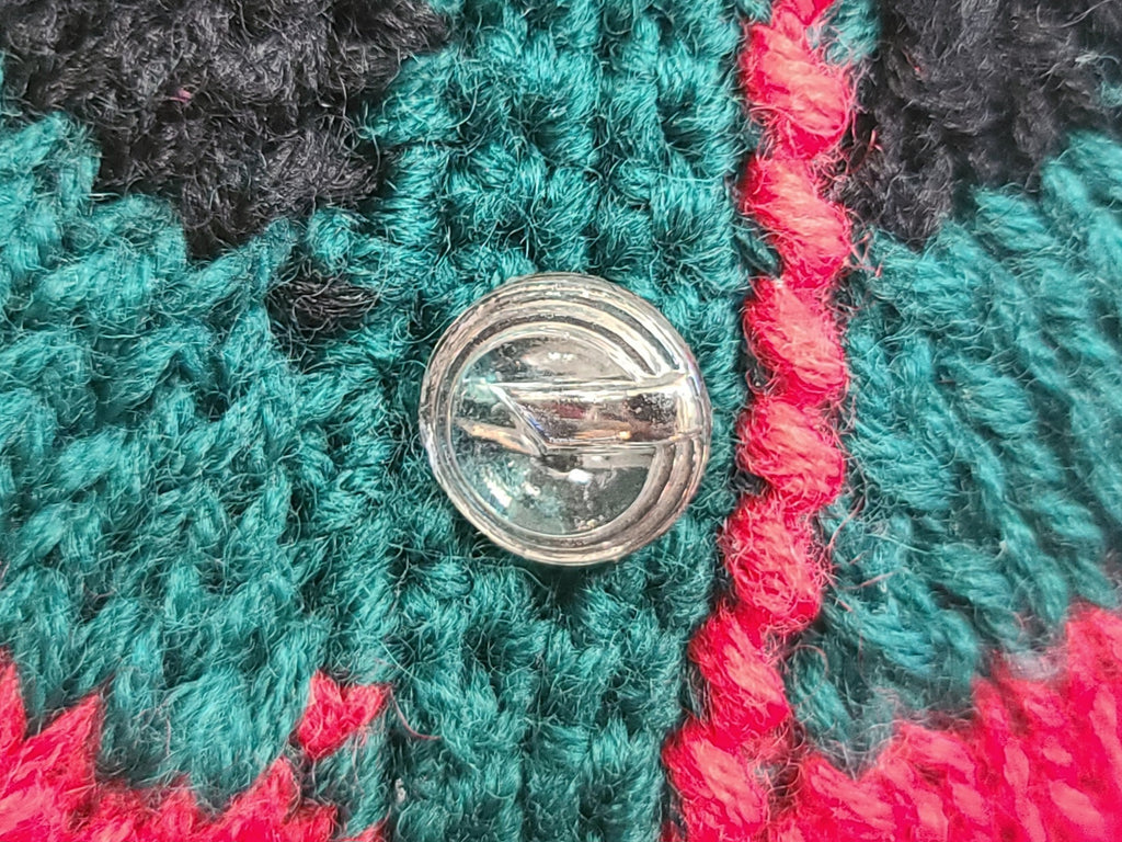 Buttons down the front with clear glass buttons that have a silver colored design in them. The knit has some "pom-pom" designs in it. Fairly good condition with light wear. Some pulls in the material and loose threads, but I did not see any holes. It looks fairly unisex, but it does button the way most women's clothing does.